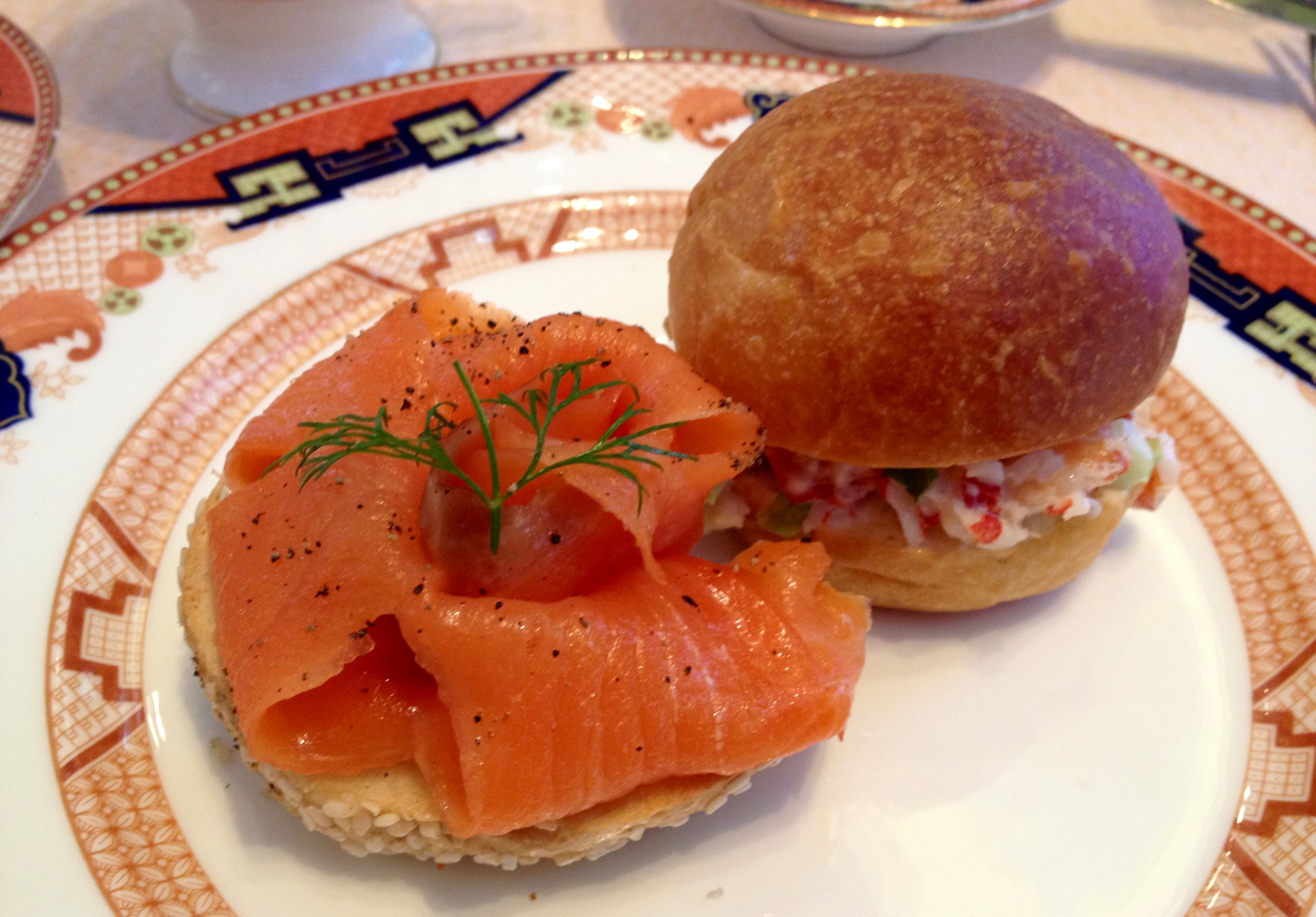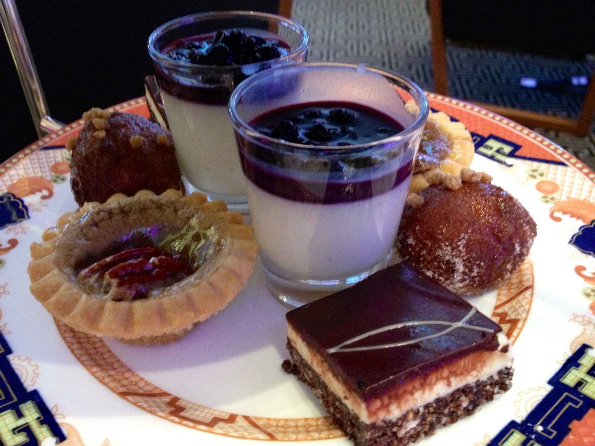 The delicious offerings of the Afternoon Tea service came in a three tiered tower of Canadiana delights. The first tier had a selection of sandwiches: Nova Scotia Lobster Salad in a Brioche Bun, Canadian Grilled Cheese on Sourdough, Montreal Smoked Meat on Rye and West Coast Smoked Salmon on Bagel with herb cream cheese. The second tier had two kinds of scones (regular and orange zest) served with marmalade, clotted cream and housemade raspberry preserve. At the top were the sweets: Glazed Pecan Butter Tarts, Wild Blueberry Yogurt, Nanaimo Bars and Maple dusted Donuts. The special care taken in the presentation, the selection of ingredients and the combination of flavours was evident.