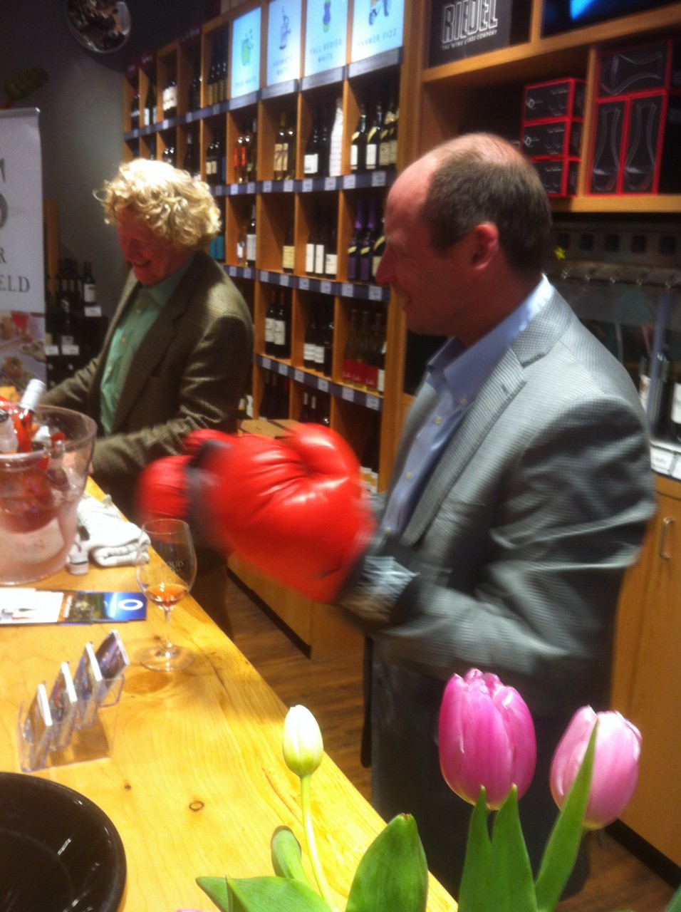 Then it was time for the highlight, The Rosé Smack Down. Michael Bartier (wearing red boxing gloves) and David Scholefield took centre stage, each defending their own choice of best Rosé. David Scholefield waxed poetically about the qualities of B&S Rosé, saying, “It is a fun wine to drink that we take very seriously. It is crisp, fresh and good with food or just enjoyed in the fresh air.” Then Michael Bartier espoused the merits of the Haywire Rosé calling it, “Bright, fresh, and pristine and speaks to me of the Okanagan. I believe in place, not grape and I think this wine reflects the area very well.”