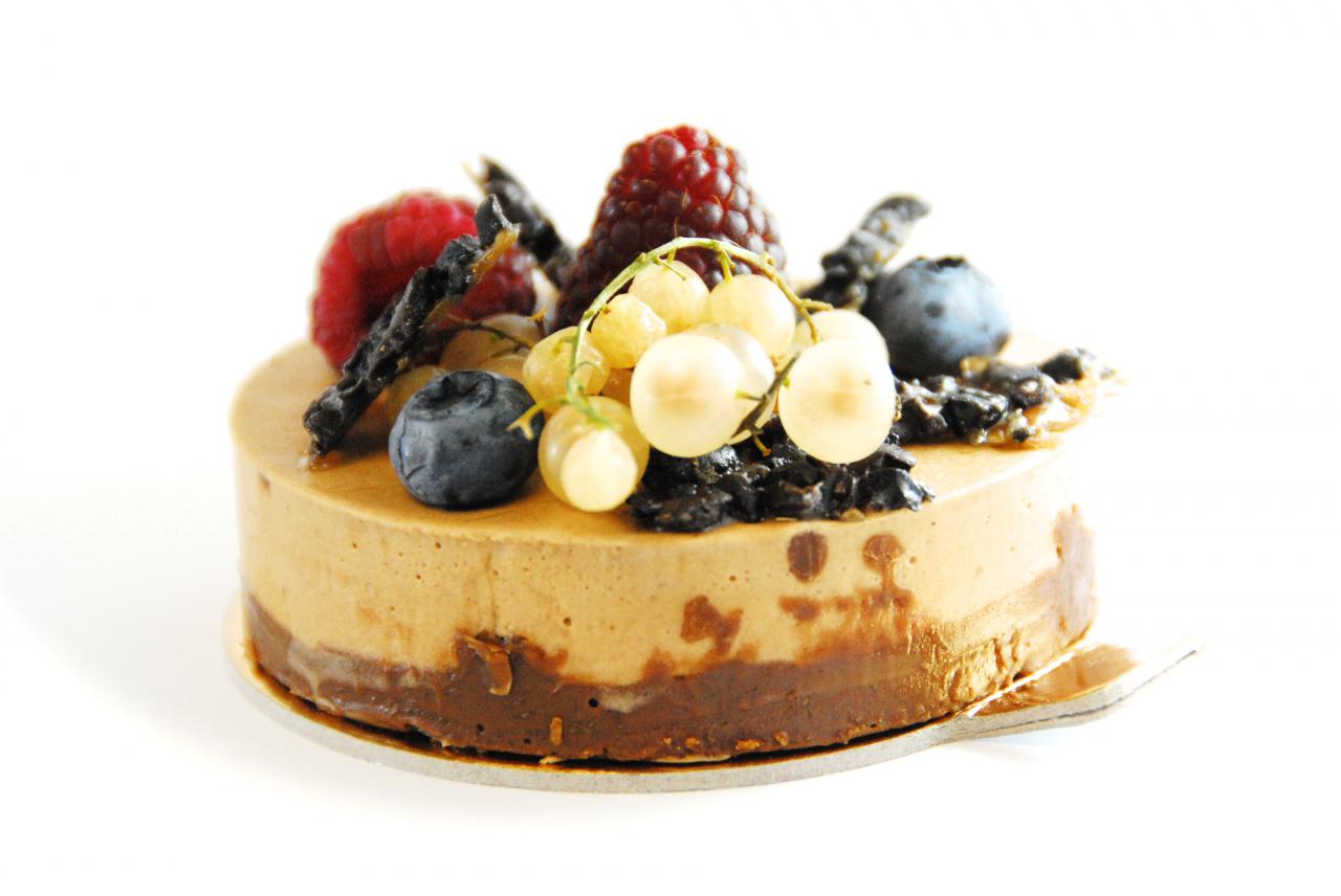 Chocolate Tart – creamy chocolate and praline base topped with a medley of berries, currents and crispy cacao nibs