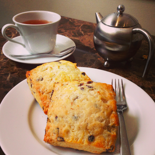 Scones: Warm, fresh-baked scones now available in Figue and Orange, Honey and Pecan, Maple and Cinnamon, Peach and Vanilla, and Currants, Nutmeg and Oat.