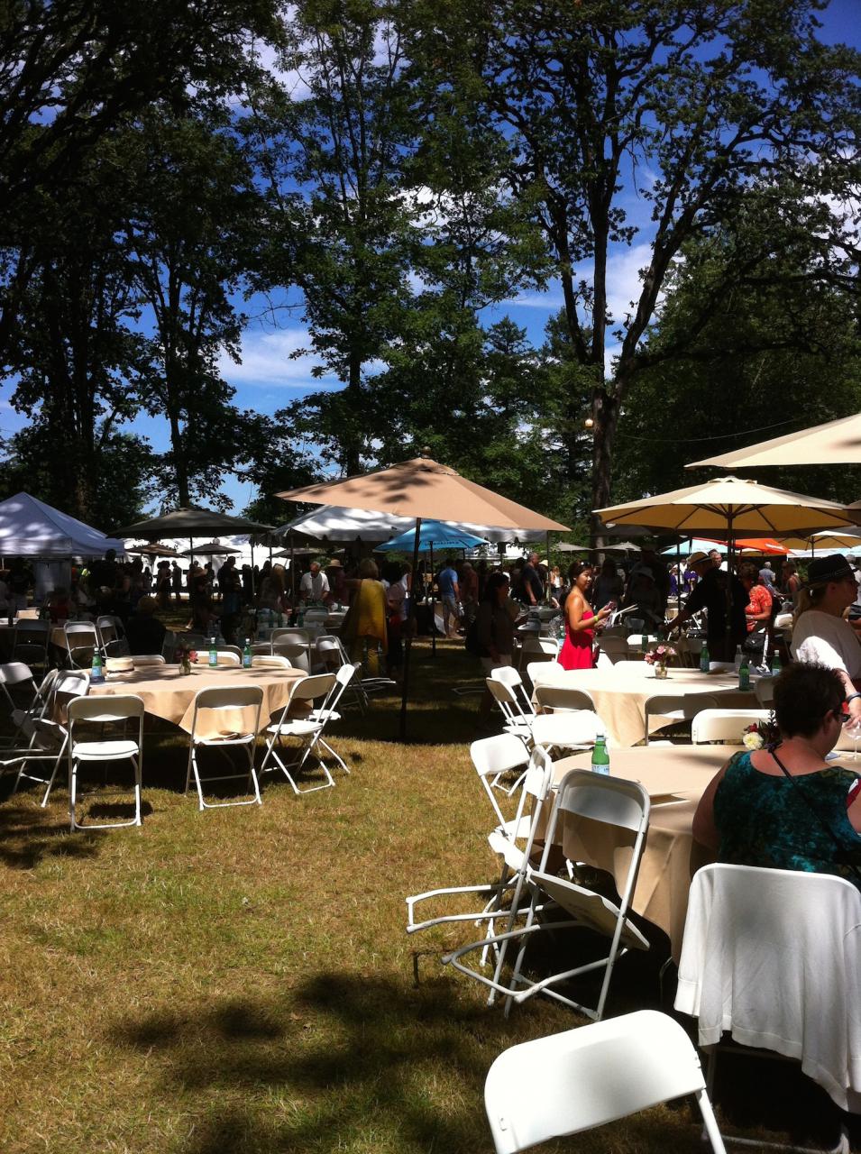 At the end of July, I was lucky enough to attend the International Pinot Noir Celebration (IPNC) at Linfield College in McMinnville, Oregon. The 27th annual event was held over three days with many activities, including lectures, guided tastings, winery tours and a salmon barbecue. Lectures covered subjects in geology, history, chemistry, and geography. This was a major meeting of the minds of those in the wine and food world. I had tickets to the Sunday “Passport to Pinot” tasting and it was held at an excellent outdoor venue – a large grassy area beneath towering oak trees. There were seventy vendors there from Argentina, BC, California, France, Germany, Italy, New Zealand, Oregon and Washington.