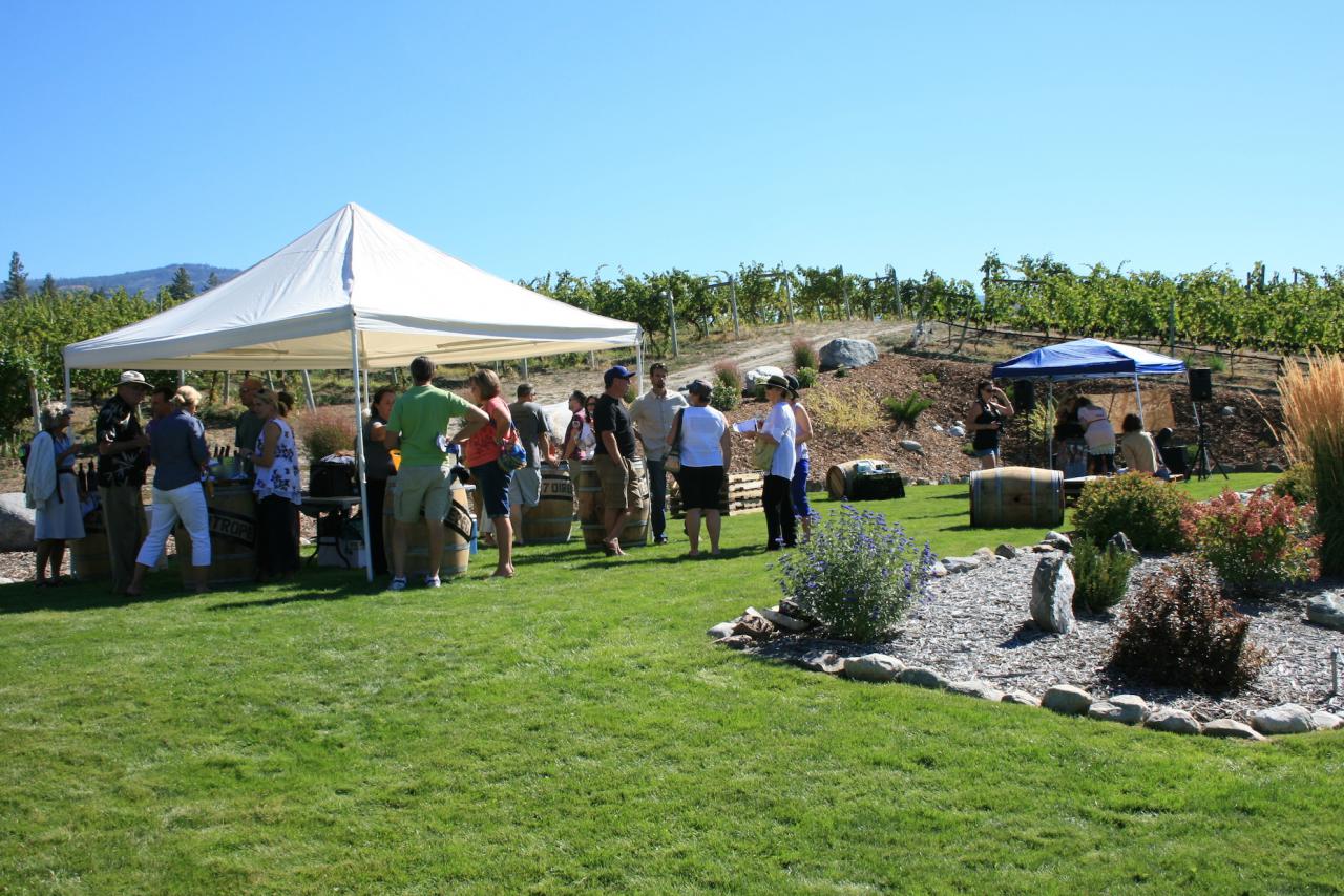 September 14th was a beautiful day in the Okanagan, especially at Meyer Family Winery in Okanagan Falls. September 14th was also the day of the first ever Garagiste North Wine Fest. This wine festival was the chance for BC’s small guys to share their stories and feature their wines. Meyer Family Wines have to be congratulated for providing the venue for this event. Upended wine barrels, located under tents, served as pouring stations and grapes were ripening on the vines directly behind us. I was very pleased to see that the event was not oversold as this provided an excellent opportunity for those in attendance to meet and chat with winery principals/winemakers. Chef Greg Fuch of Gregor’s Gourmet was there to provide yummy bites to pair with the wines being served. Aidan and Mandy, a local duo, provided entertainment for the afternoon. BC Wine Guru, John Schreiner was in attendance busily scribing notes and taking photos for his well-known blog, “Goodgrog”.