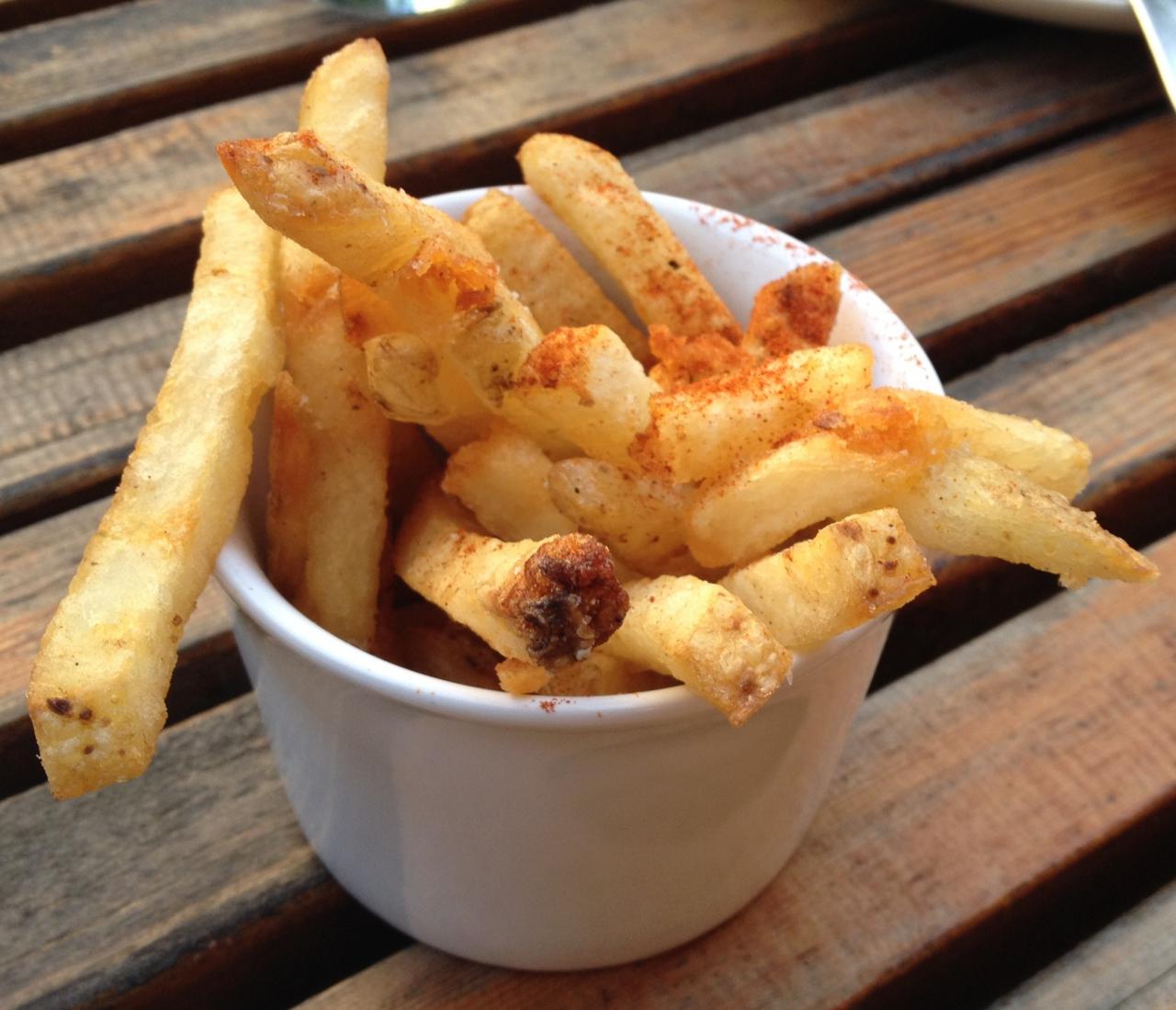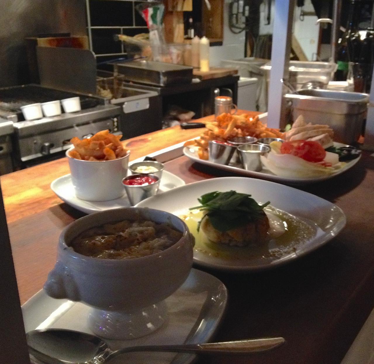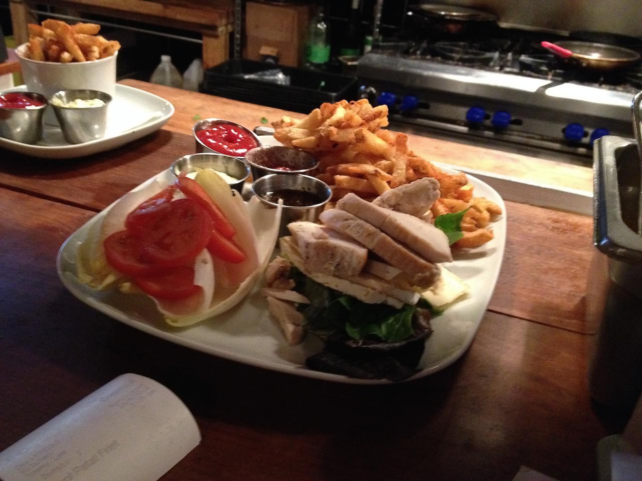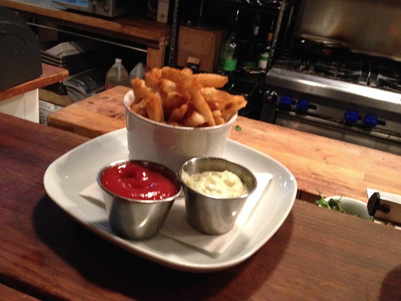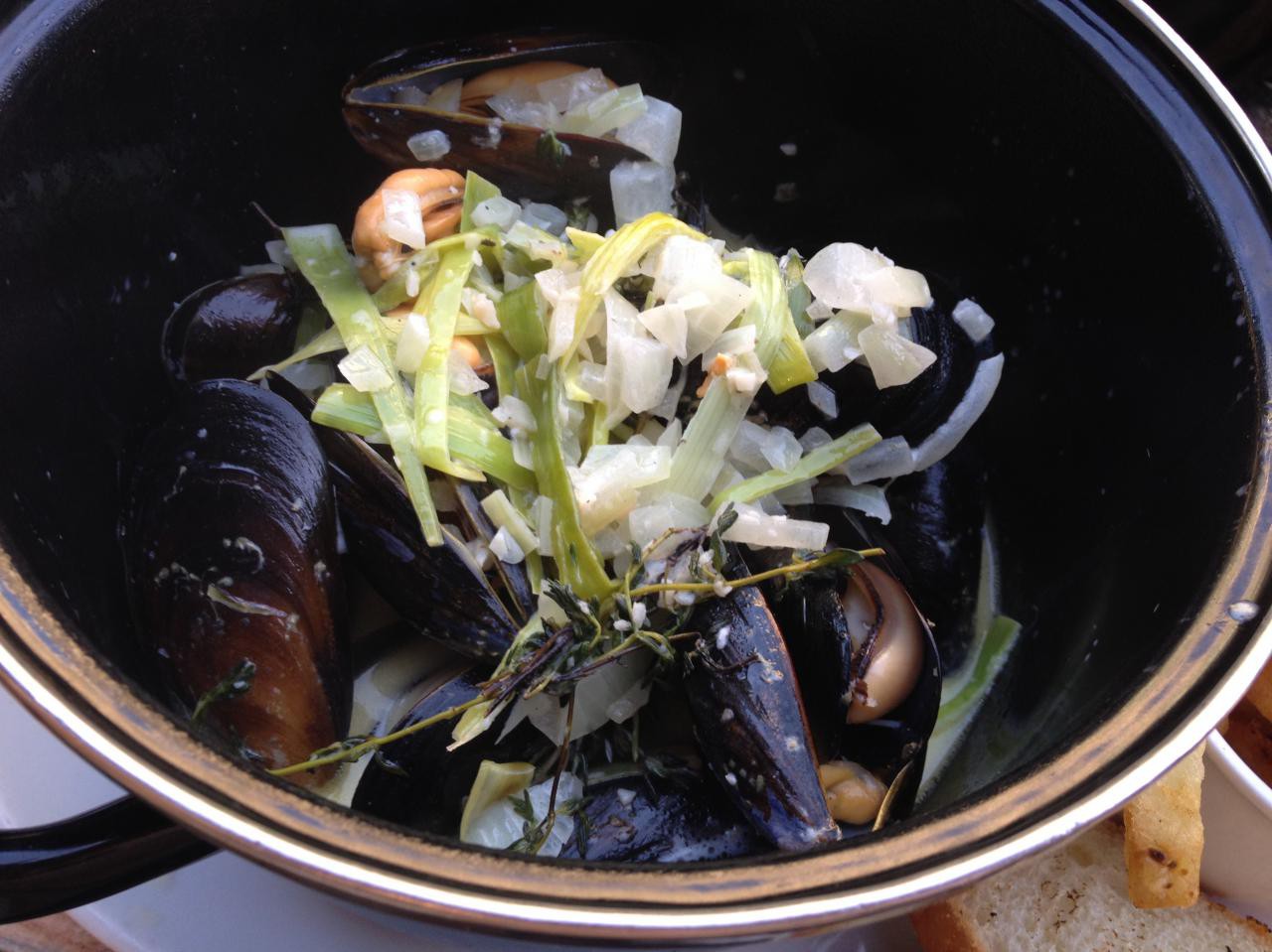The inaugural Sunday Night Supper was a three course meal starting with artisanal greens and a tangy pesto vinaigrette. The second course was a full pound of Gulf Island mussels in a leek, white wine & cream broth with crostini and aioli on the side for soaking up all the tasty broth. The mussels were plumb and delicious. Perfection in a pot, accompanied by a dish of thrice fried frites lightly sprinkled with paprika. Absolutely the best fries I’ve had in Vancouver. We opted for a Pentage pinot gris but the dish would have paired equally well with any one of the number of beers available, both bottled and on tap.