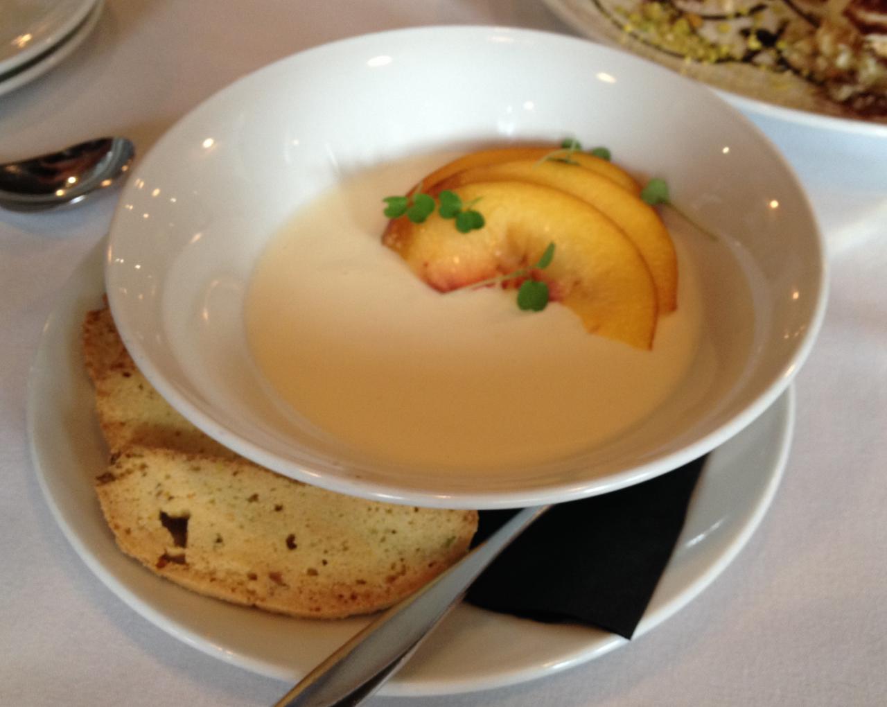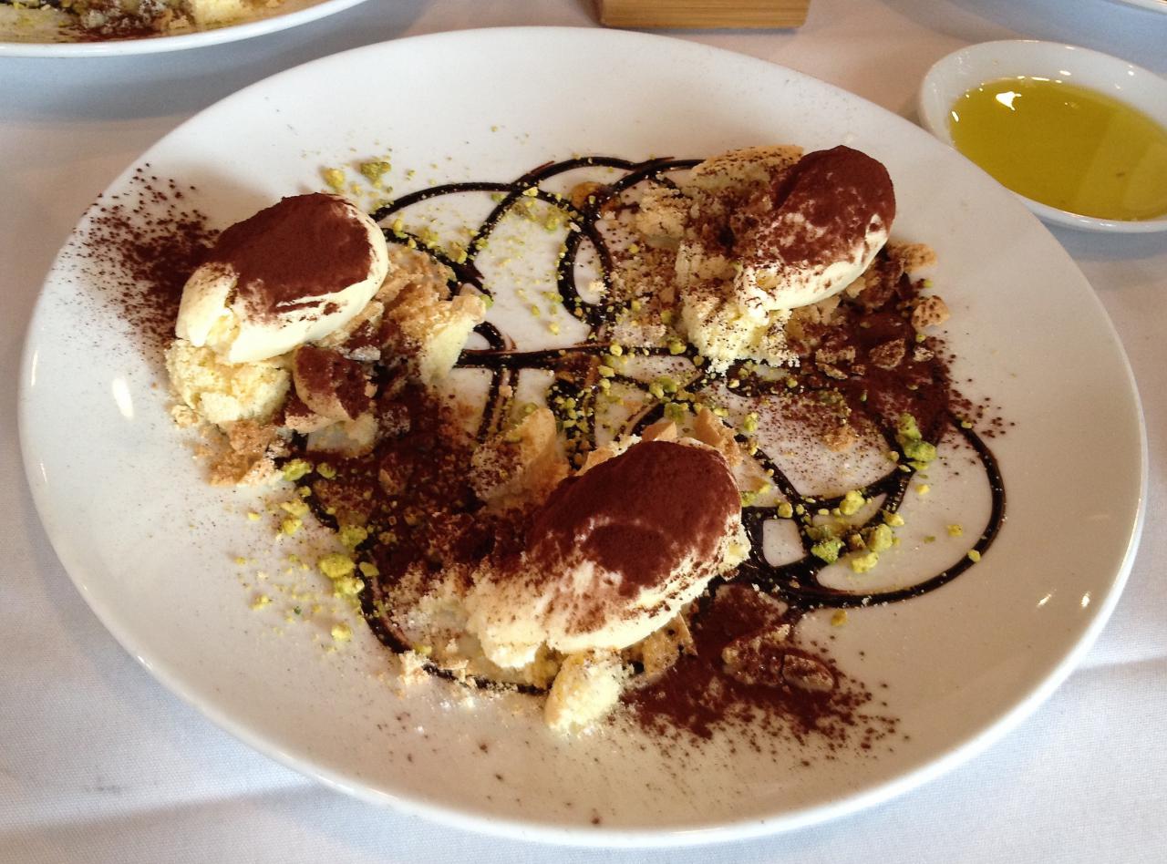 Just when we thought we couldn’t possibly eat any more the desserts were placed on the table. Too good to pass up we indulged in a Lemon Creme with fresh peach slices and a biscotti. The second dessert was a deconstructed Tiramisu. Both desserts were quite light and were a satisfying finish to an excellent meal.