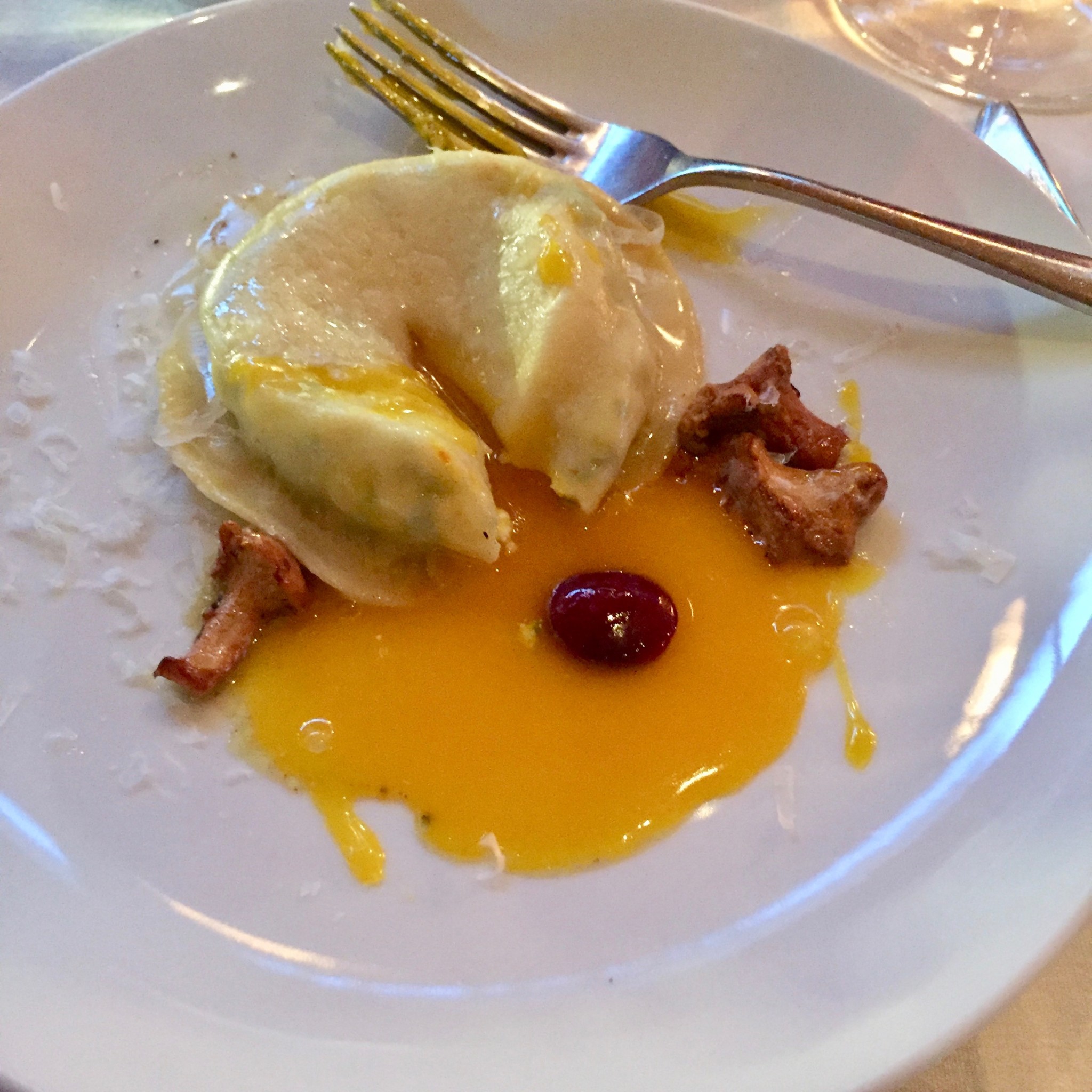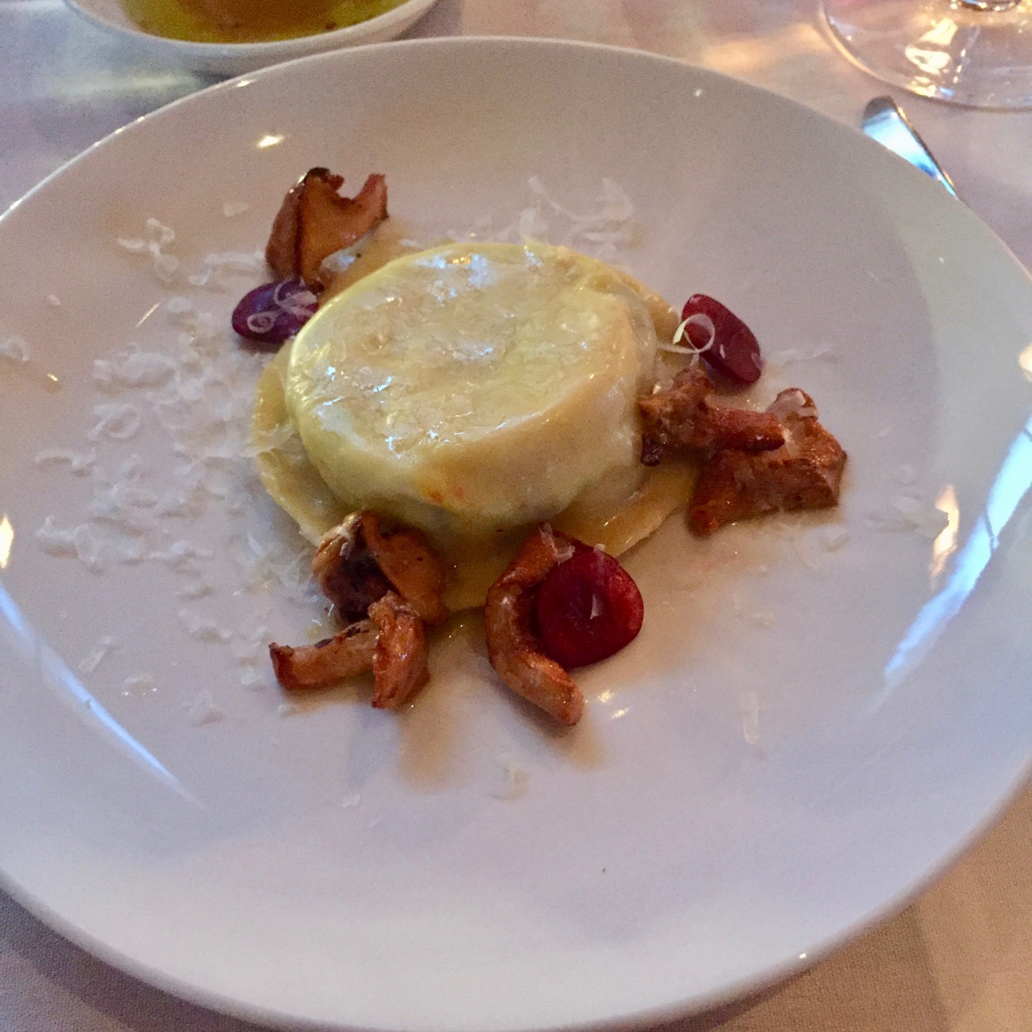 Duck Egg Raviolo Otimo, Chanterelle Mushrooms, Cultured Butter Sauce and Cherries