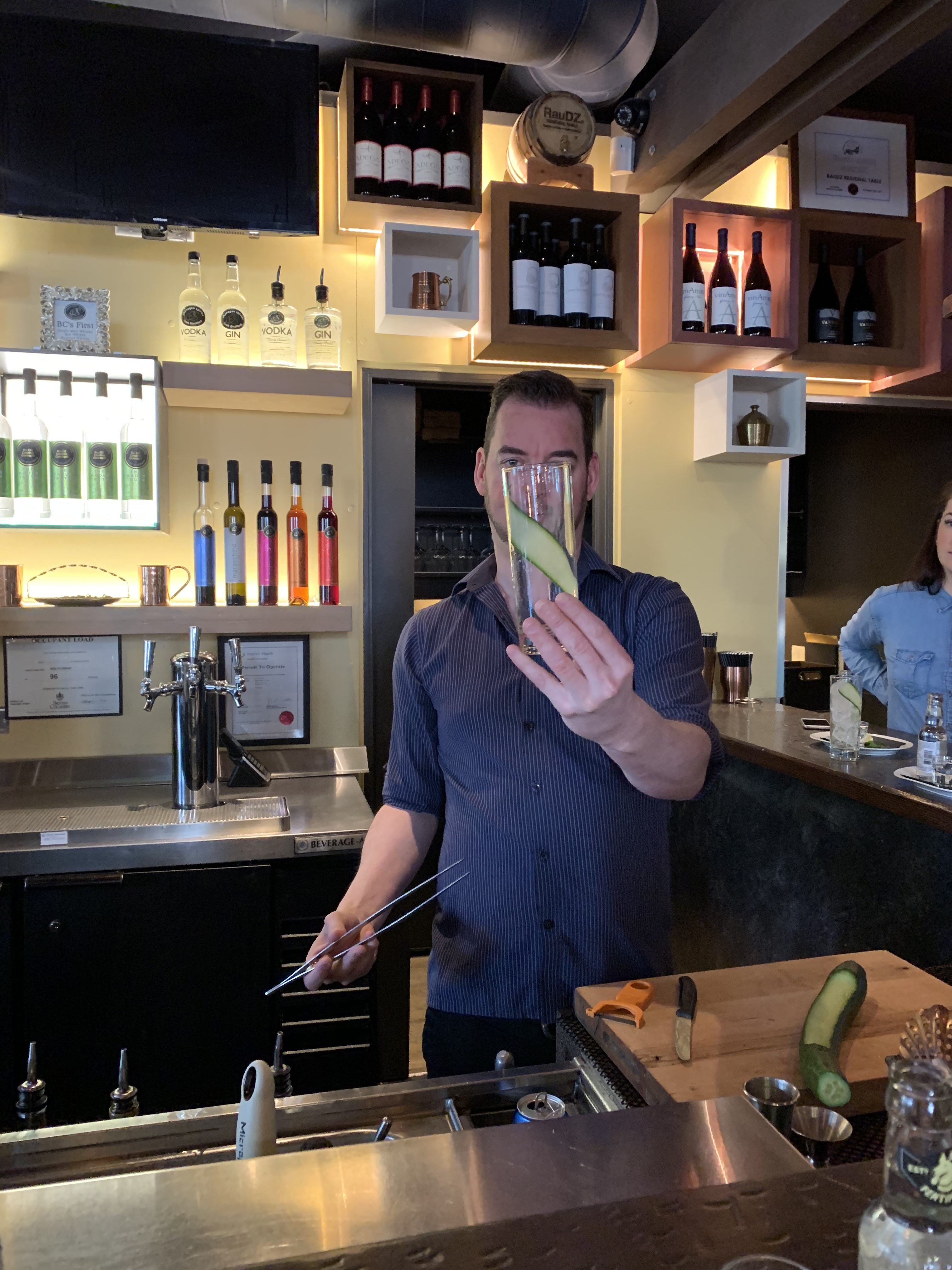 Jeremy shared the story of this great collaboration with RauDZ and related how Melissa’s twin, Tyler Dyck had hand foraged one of the botanicals. At Poplar Point at the foot of Knox Mountain, less than three kilometres from the restaurant, he picked the native BC shrub, mock orange. In this farm-to-flask gin, you’ll also find regional elements of mint, cucumber, lemon verbena and orris root (root stock of an iris). How fitting for the RauDZ philosophy of ‘eat local’ to embrace ‘drink local’.