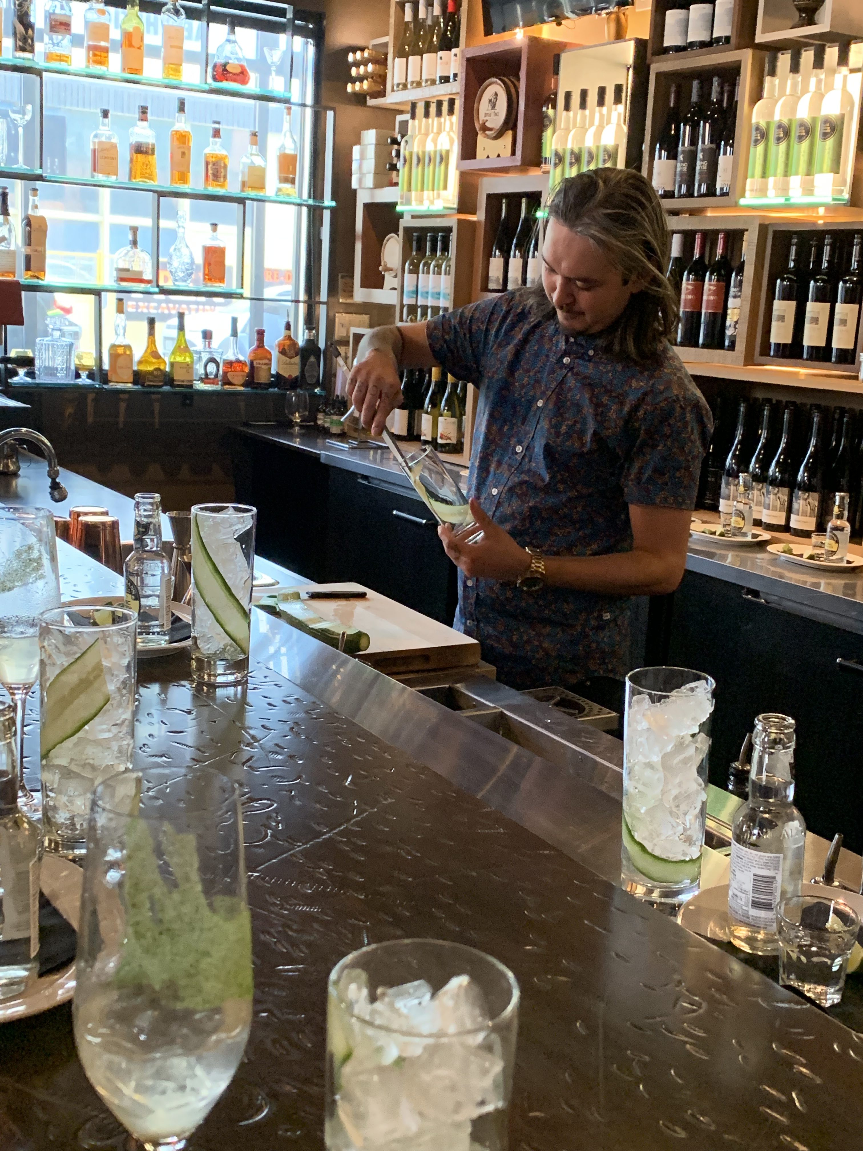 Stations were set up at the bar for participants to recreate ‘The Whole Truth’ gin-and-tonic although we were given a head start with the cucumber carpaccio lining the glass ready with ice. We added the cute little airline size bottles of gin, Fentimans Tonic and a squeeze of a lime slice before adding a mint sprig. While we enjoyed our refreshing results, the bartenders demonstrated the skill required to perfectly install that cucumber carpaccio with a little race against each other.