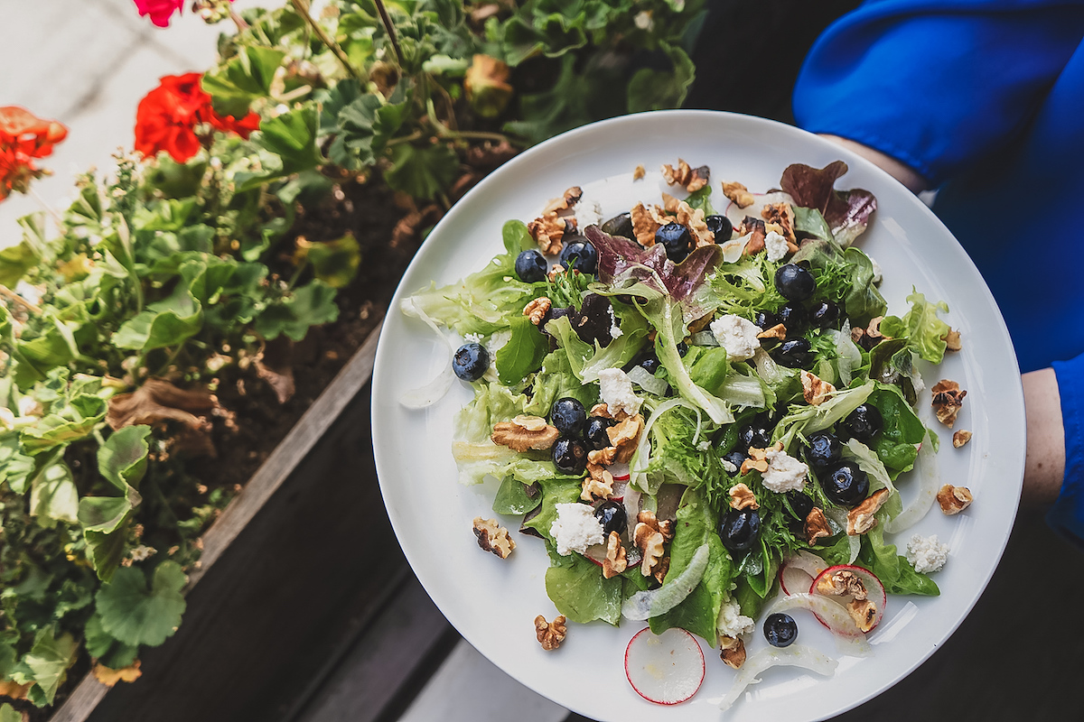 Blueberry and Spinach Salad with almond feta, toasted walnuts and a shallot vinaigrette VG/GF