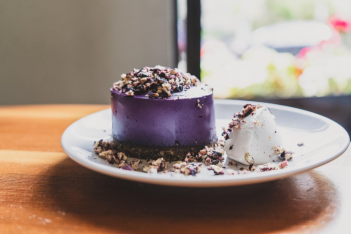 Blueberry Cheesecake with coconut vanilla bean whip cream and freeze dried blueberry VG/GF