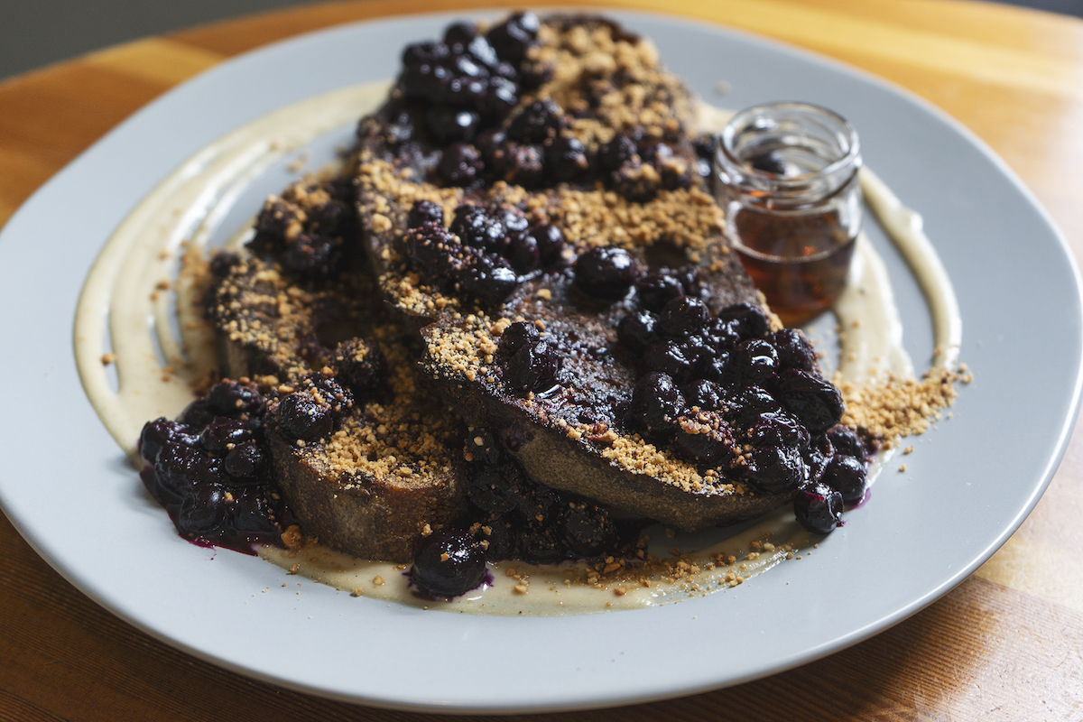 Blueberry French Toast with cashew vanilla bean cream and hazelnut praline VG