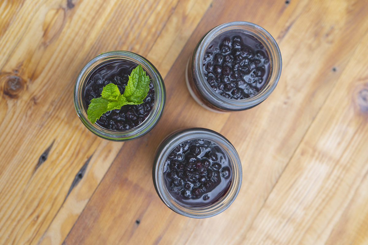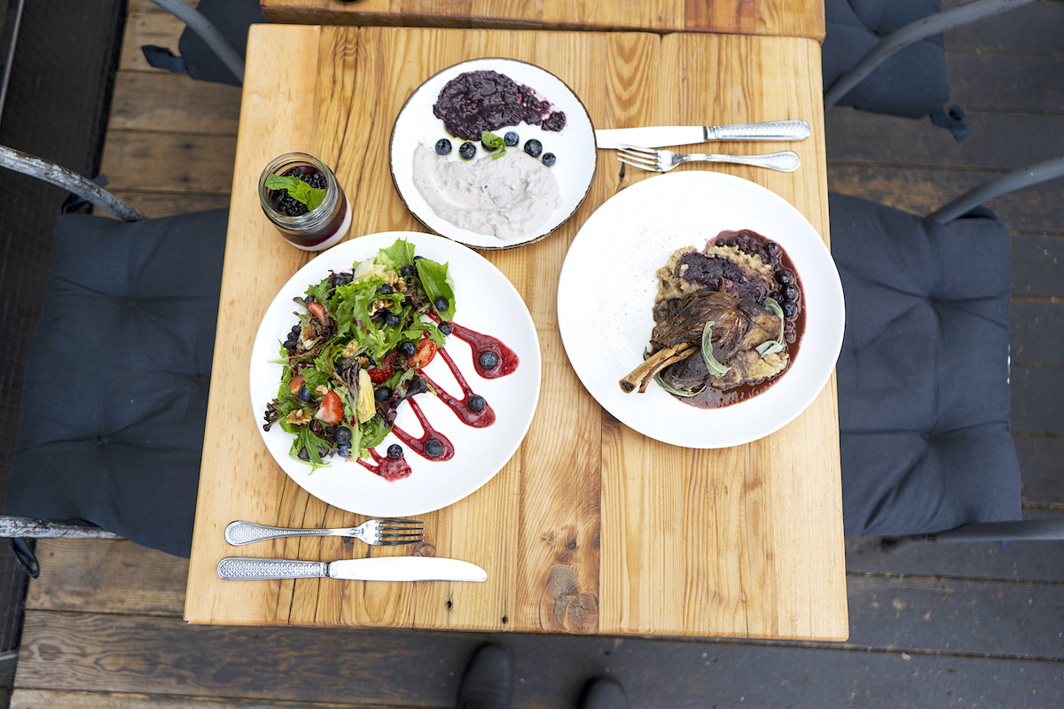 Blueberry + Artichoke Salad. Lamb Shank with Blueberry. Jus Blueberry Milk Pudding Sweet blueberry hummus, a blueberry sour cocktail