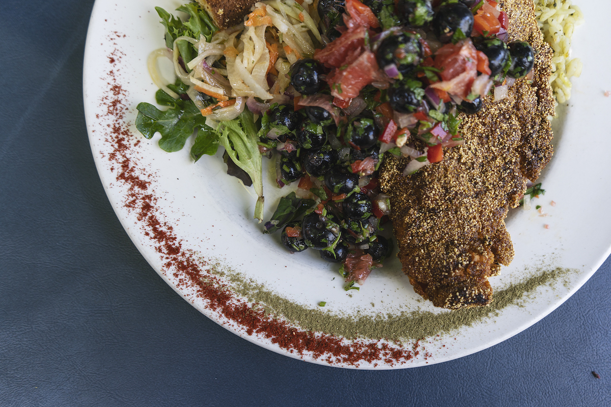 Buttermilk Marinated-Cornmeal Crusted Catfish Filet with Blueberry-Pink Grapefruit Salsa, Red Beans, Green Rice and Cornbread – $18.50