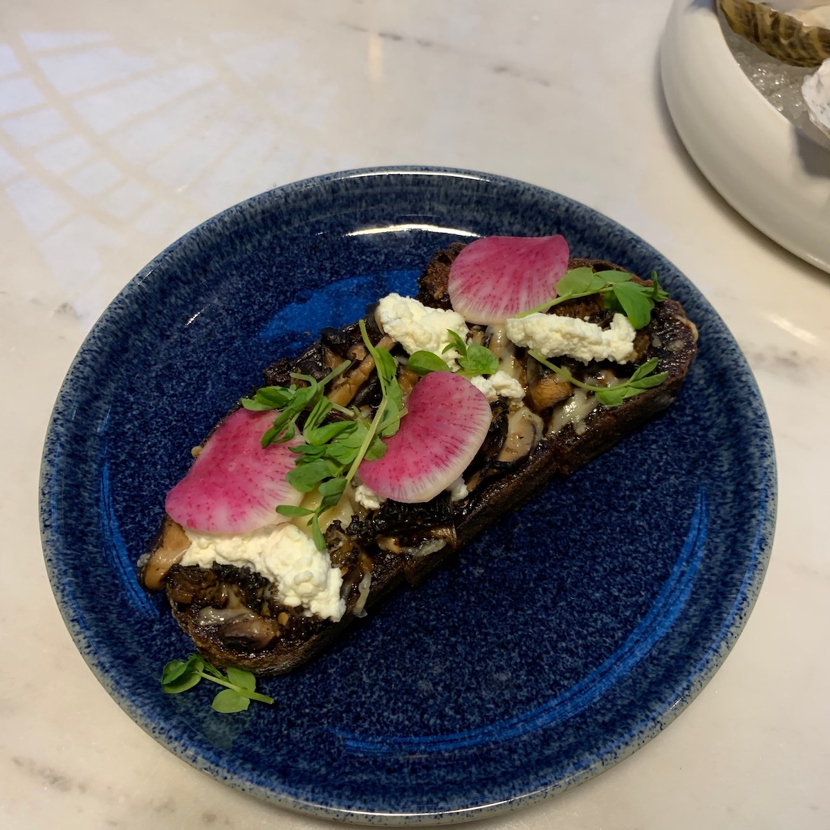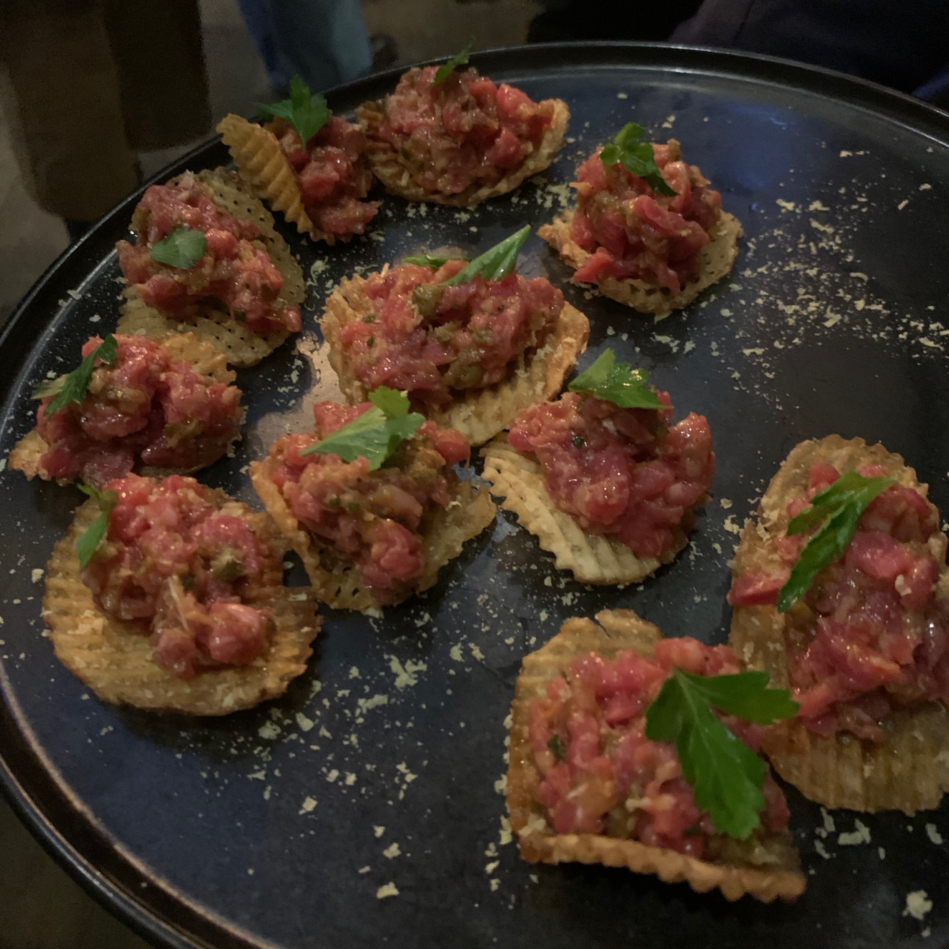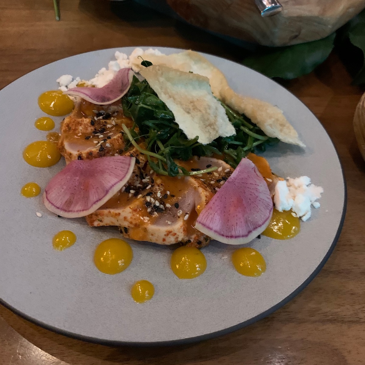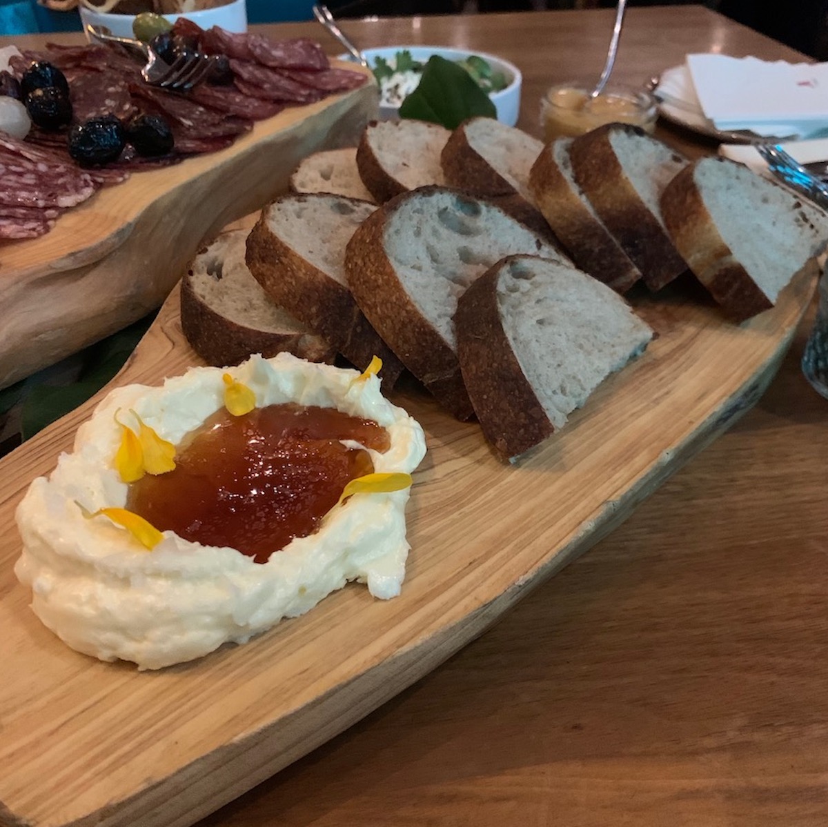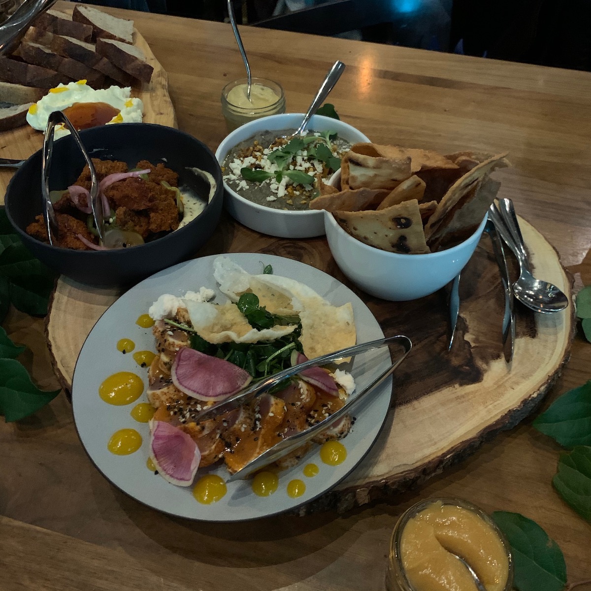 We were once again greeted by a friendly and welcoming team who escorted us to a couple of high tops that were laden with even more food. Baked in-house sour dough bread with whipped butter and their very own honey from the rooftop hives. If you haven’t tried it yet make sure you do, very soon. There were many dishes that paired well with the special seasonal cocktails. Eggplant dip with pumpkin seeds, Southern fried chicken pieces which were a big hit, cheeses, charcuterie, olives and some very addictive deep fried naan bread. I couldn’t keep my hands off them, they were like eating potato chips where you can’t stop at one, so why would you want to.