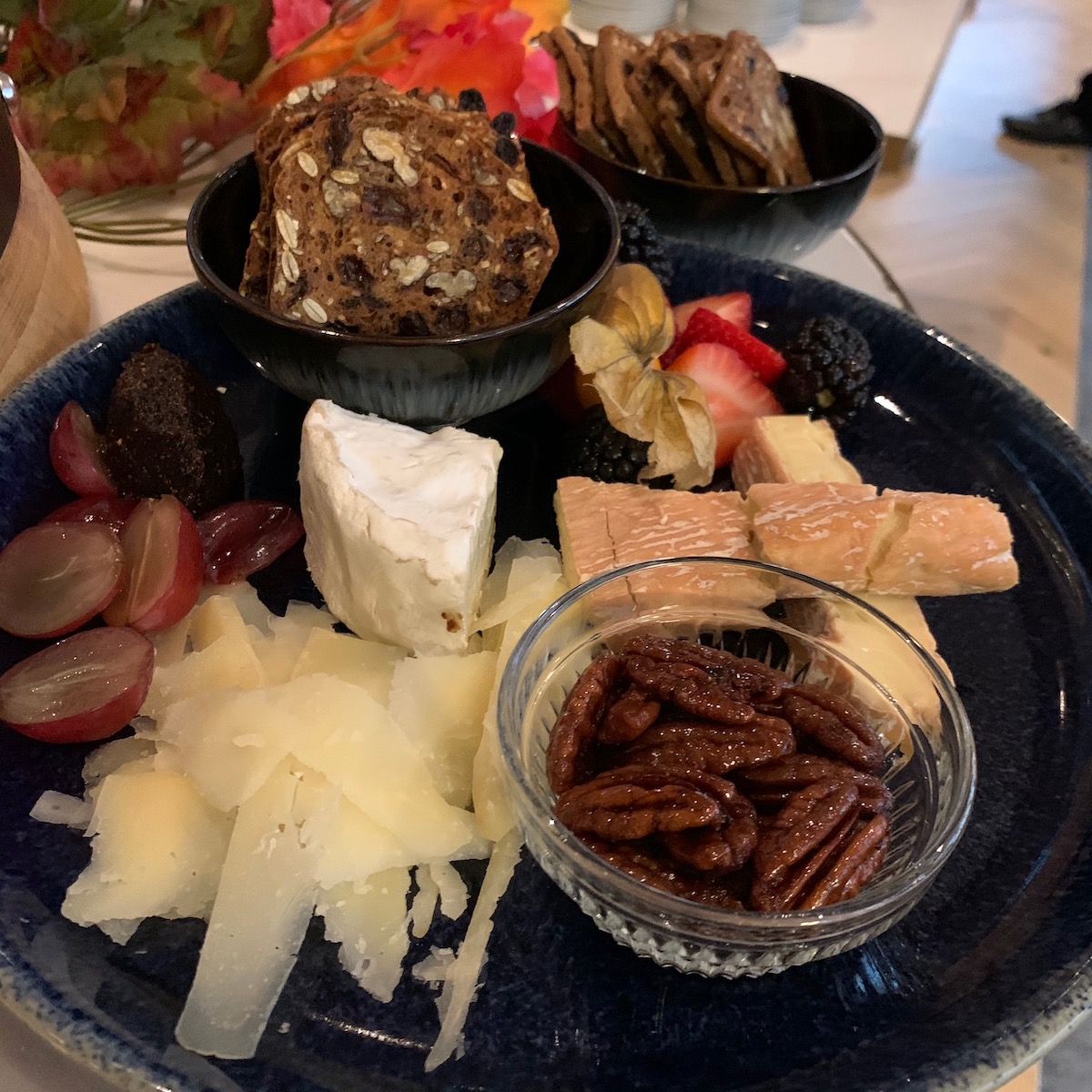 The Lounge is very swish with banquette seating running the length of the room directly under a half wall of glass that lets the lights of the landscaping send reflections into the room. On another outside wall is a massive fireplace with a cozy seating area with sofas and a huge coffee table. The room is so inviting but first I wanted to cruise around and take it all in. Food stations had been set out for us and everything was so very good.