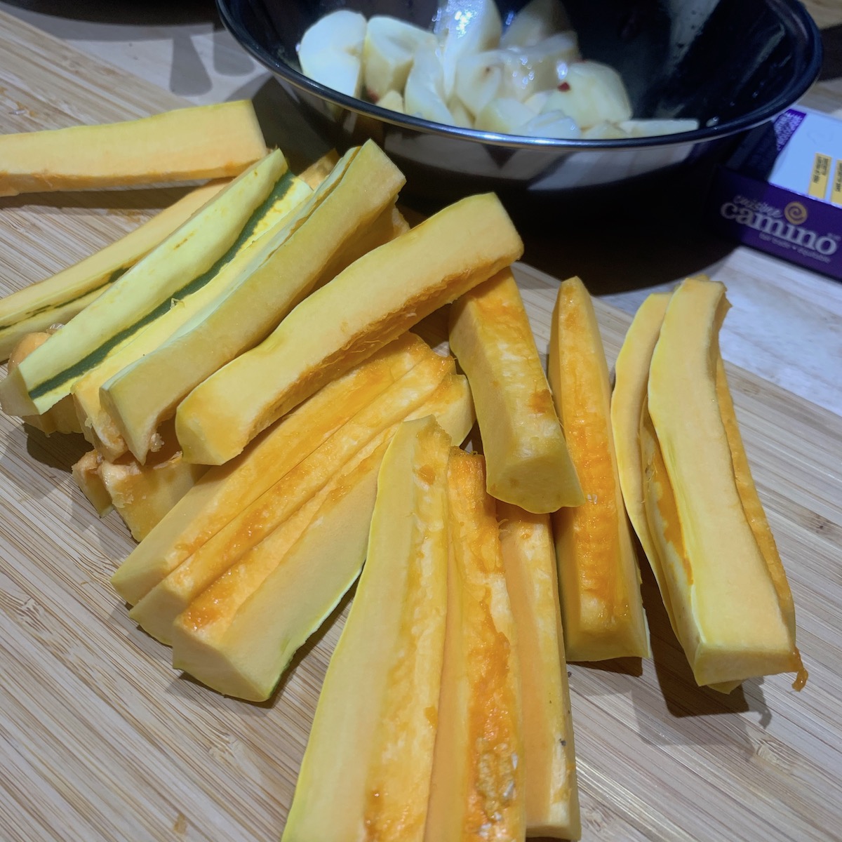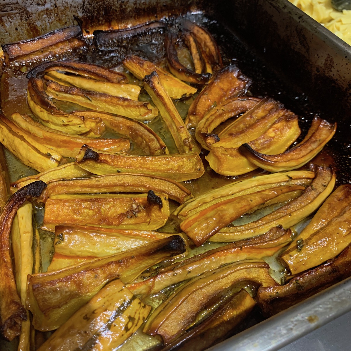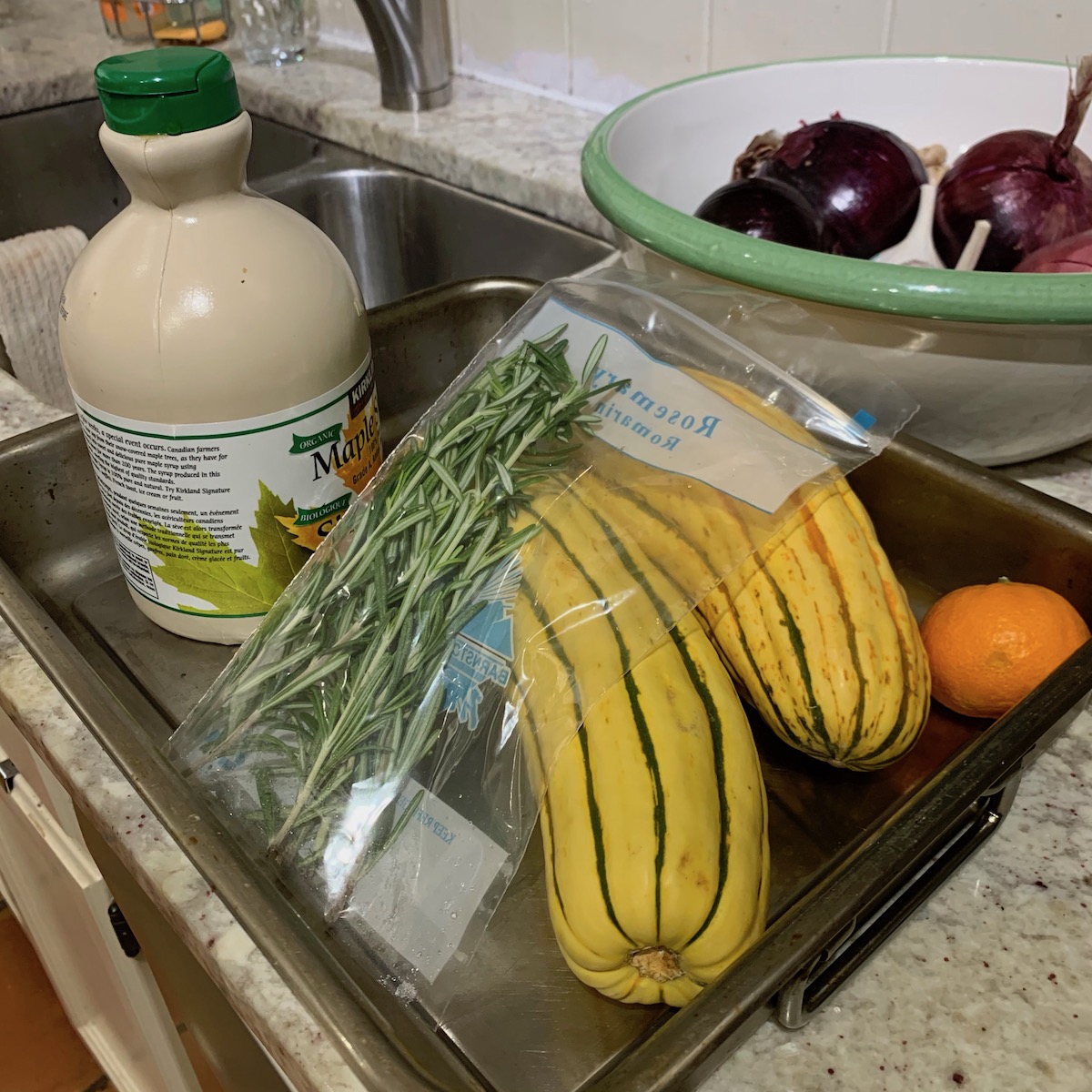 Meantime the slices of Delicata squash, which were not peeled because the skin is tender after cooking, were mixed with unsalted butter, chopped rosemary, drizzled with maple syrup and baked in the oven.