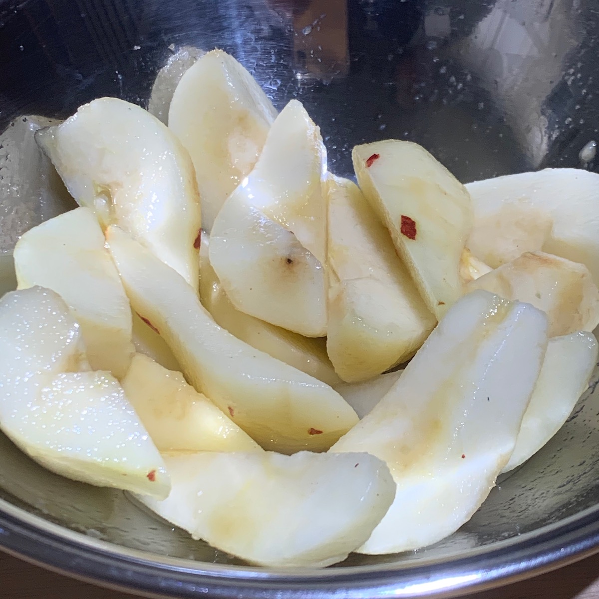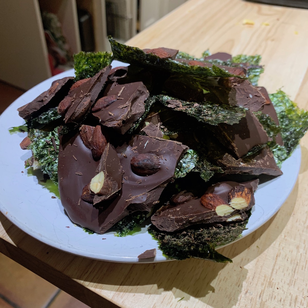 FYI the guests do a lot of the work. We donned aprons and took up knives to prepare the Delicata squash. Each of us with our own cutting board. There were also pears to peel, core and slice. Dark chocolate bars to be chopped for the dessert. Once the chocolate was melted (during the process vegetable shortening was added to the dark chocolate) it was spread onto nori seaweed and topped with Tamari almonds. Into the refrigerator to harden this became a sweet and savoury dessert.