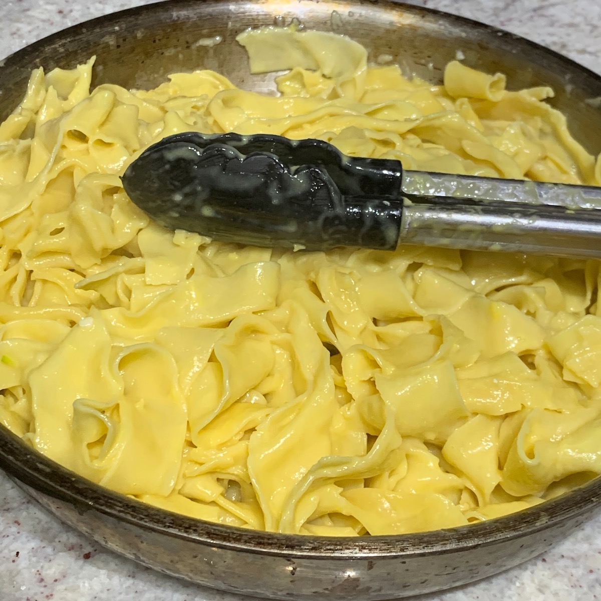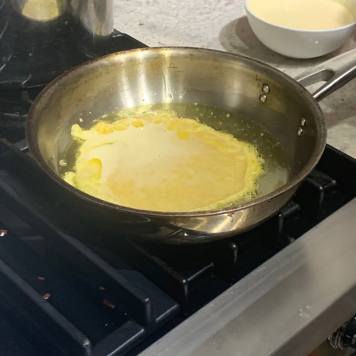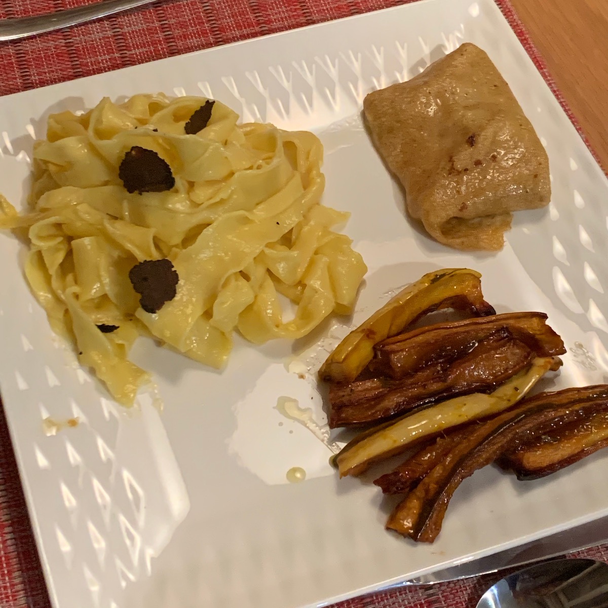 While the crepes were heating in the oven, once the squash was almost done, we watched as Emily added eggs and a minced garlic to a frying pan for carbonara. The fresh pasta takes only a very few minutes to cook, watching for the water to turn white in colour indicates when the pasta was ready. The pasta was added to the frying pan without being drained adding a small amount of pasta water to the mix. The pan never returns to the stove so the egg evenly coats the pasta and cooks slowly just from the warmth of the pasta.
