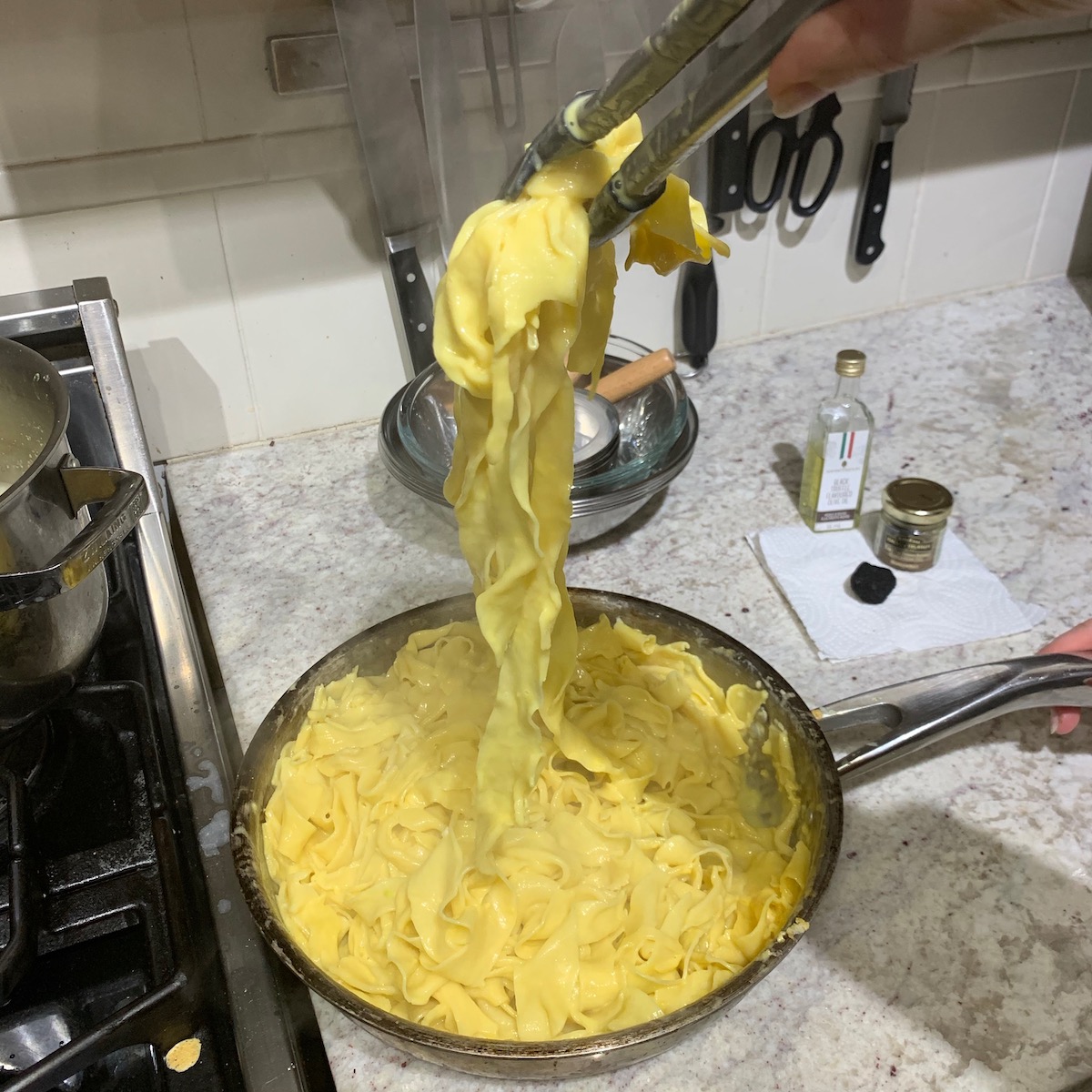 While the crepes were heating in the oven, once the squash was almost done, we watched as Emily added eggs and a minced garlic to a frying pan for carbonara. The fresh pasta takes only a very few minutes to cook, watching for the water to turn white in colour indicates when the pasta was ready. The pasta was added to the frying pan without being drained adding a small amount of pasta water to the mix. The pan never returns to the stove so the egg evenly coats the pasta and cooks slowly just from the warmth of the pasta.I couldn’t resist the invitation to join three other foodie types to head over to the Dunbar neighbourhood to experience an evening with Emily Lycopolus. Lycopolus is a chemist turned chef, recipe curator, cookbook author, cooking teacher and olive oil sommelier.