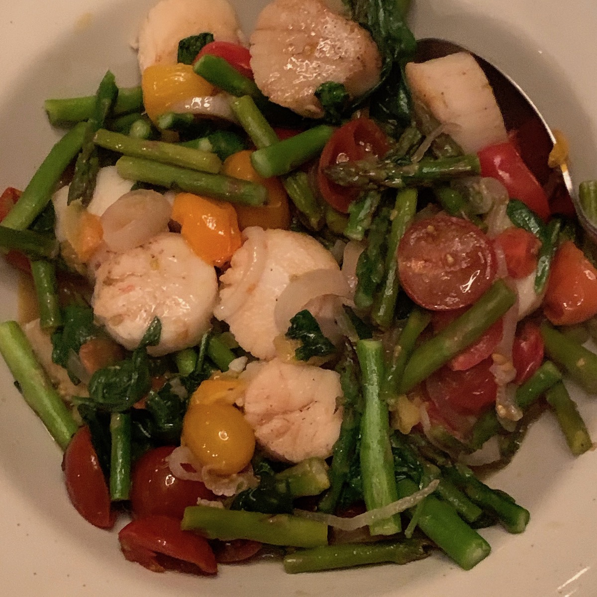 In a large skillet, heat 2 tablespoons extra-virgin olive oil over medium-high heat. Season the scallops with salt and pepper, add to the skillet and cook for 1 minute. Add the asparagus, cherry tomatoes and red onion and cook for 2 minutes. Turn the scallops, then cook until the tomatoes are shriveled and the scallops are cooked through, 2 to 3 minutes. Remove from the heat. Stir in the spinach, then cover and let stand until the spinach is wilted, about 1 minute. Note: I cooked with vegetables separately because I like my scallops just done with good caramelizing which you don’t get when you mix in the vegetables. No surprise I added butter to the olive oil for searing the scallops.