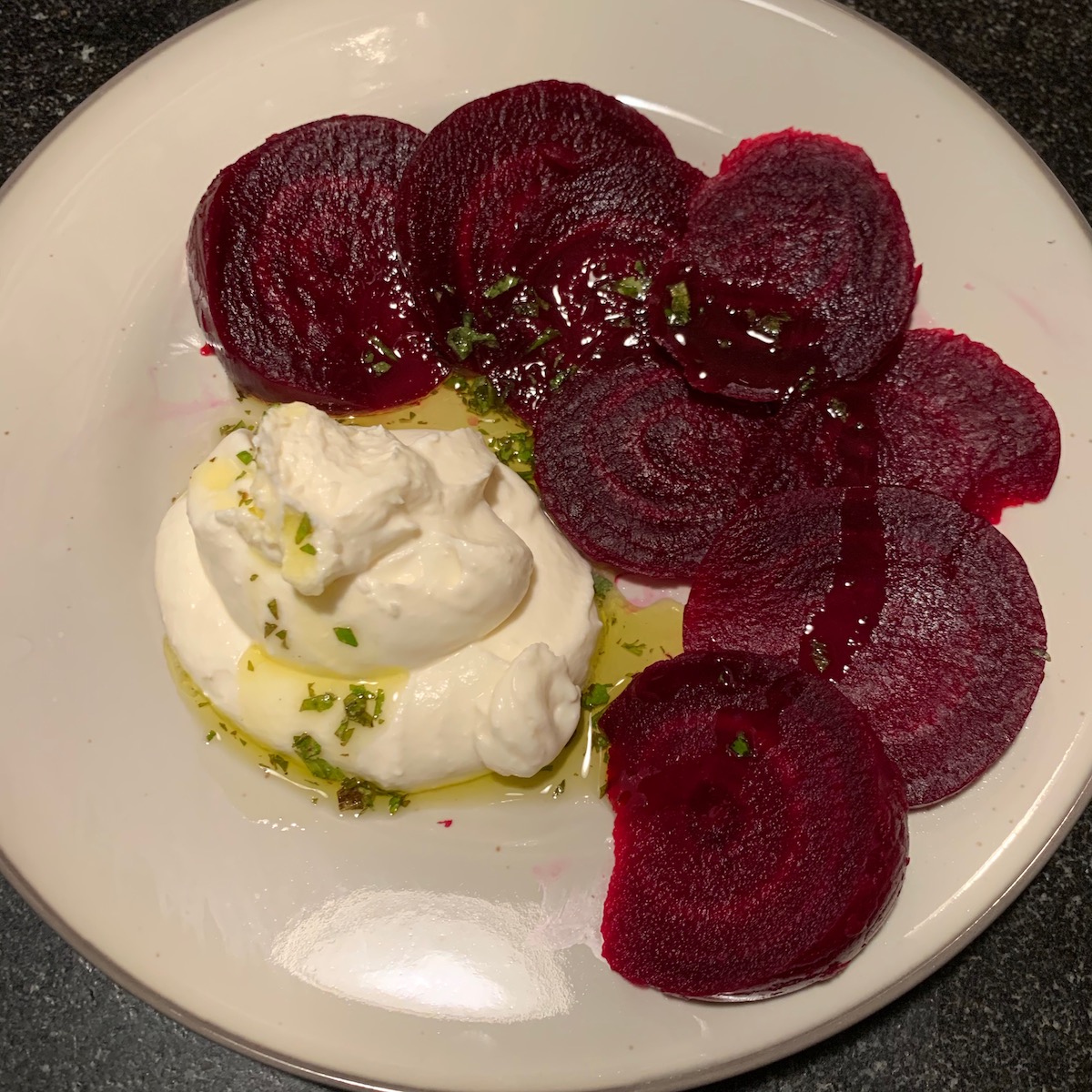 Also served: first course a Beet Salad. Very simple thinly sliced cooked beets (I used red but a variety would also work) finishing salt, goat cheese mixed with whipping cream to make a soft and smooth consistency, top with a good quality olive oil and freshly chopped mint.