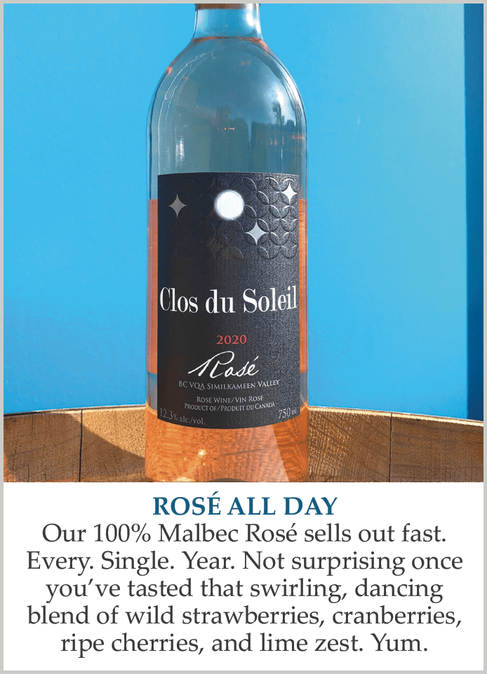 Spring has sprung, bringing with it new wines! Clos du Soleil’s Spring releases are finally here, ready for the drinking, and hopefully soon, the sharing with friends. Get yours while stocks last. (Seriously, though, our Rosé in particular sold out in a hot minute last year – it was all very heart-palpitating – so do place your orders soon.)