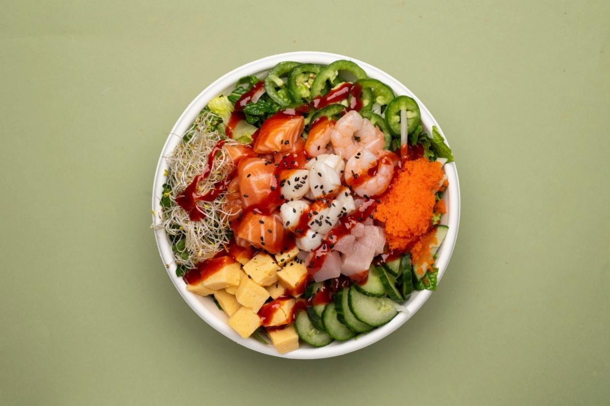 - I Sea Food: Offers a mix of salmon, albacore tuna, shrimp, and scallops, paired with romaine lettuce, cucumber, sweet onions, tamago, jalapenos, masago, alfalfa, sesame oil, black sesame seeds, and sweet chili sauce.