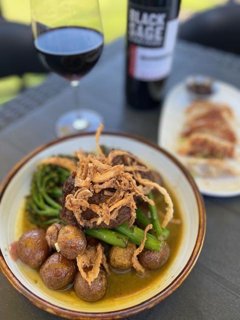 Having had the classic comfort foods the evening prior, we opted to share one of the mains, the Braised Short Rib. Served with baby potatoes, grilled broccolini and crispy onions, the meat was flavourful and fell apart at the touch of our forks. I had a glass of Black Sage Cabernet Sauvignon from the Okanagan.