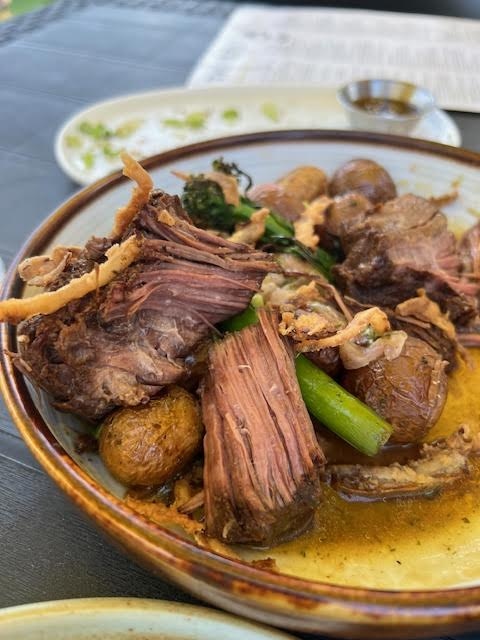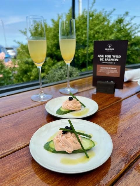 We sat on the sunny patio. Pleasing live music accompanied our meal. After a welcome glass of non-alcoholic passionfruit spritz and salmon mousse bites, we ordered a variety of plates to share. Our favourite was the Bison Carpaccio, closely followed by the Strawberry and Basil Burrata. The West Coast Crab Cakes – a QBC tradition – and the Tuna Tartare rounded out the assortment. Considering how well- fed we had been, I was surprised and impressed that we finished everything.