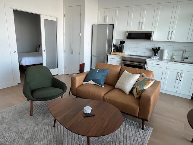 Conveniently located below the Nanoose Bay Cafe, our suite has been thoughtfully designed for both short- and long-term stays. The living area has a full kitchen, in-suite laundry, and floor-to-ceiling windows that bring in natural light. The bedroom features a comfortable queen-sized bed, ample closet space and an en suite four-piece washroom. The space is modern, tranquil and equipped with heating, air conditioning, Smart TV and WiFi. The private deck overlooks the marina and is the perfect spot from which to bird watch.