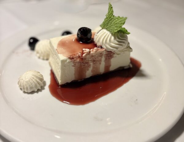 greek yogurt cheesecake, whipped ganache, topped with Amarena cherries, graham crust, fresh mint