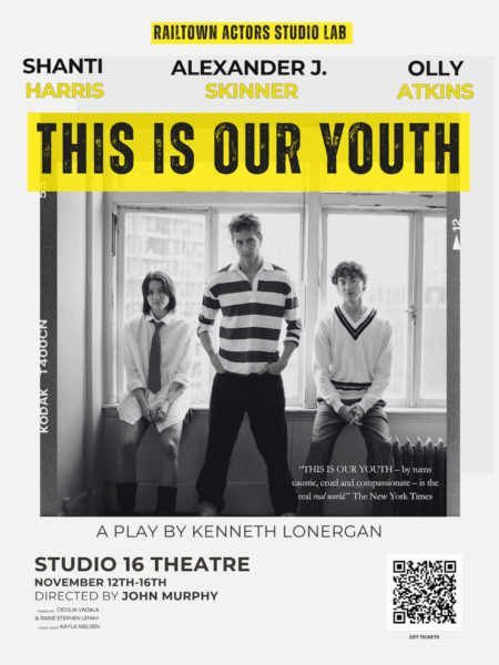 Railtown Actors Studio Lab presents THIS IS OUR YOUTH, a raw and nostalgic coming-of-age story set in 1980s New York City. Directed by the acclaimed John Murphy, the production stars three rising Vancouver actors—Alexander J. Skinner, Shanti Harris, and Olly Atkins—in a gripping, funny, and painfully relatable portrayal of young adulthood.