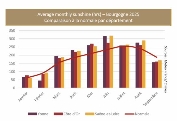 The early, sun-filled season (see the sunshine chart below) particularly benefited Aligoté, producing wines that strike a beautiful balance between acidity and alcohol.