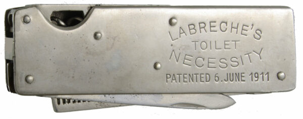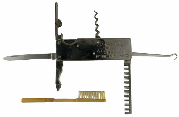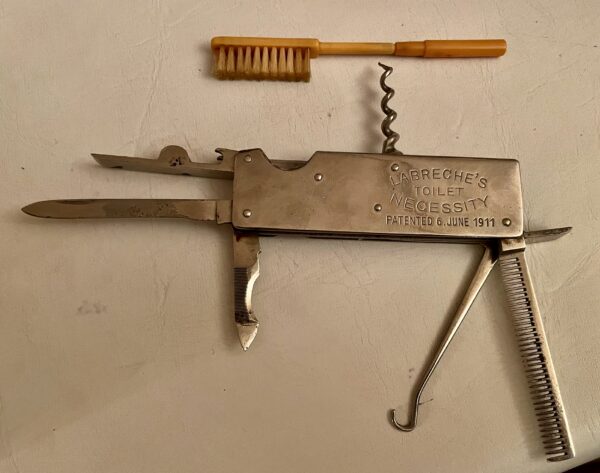“A very rare Canadian patent #: 133,584, 06,06, 1911- by Joseph Charles Augustus Labreche – Joliette, Quebec, Canada. I am only aware of three Canadian patented tools containing corkscrews, ever being found to date. This is one of two of these found to date. The toothbrush has a reversible handle. Either extending the handle or reversed such that it fits over the smaller handle on the brush. It is stored under a trap door above the knife blade.”