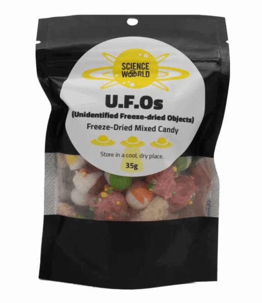 Meet U.F.Os: Unidentified Freeze-Dried objects—not flying saucers (we’re a science centre, after all)! Explore a medley of sweet, tart, and crunch with Rainbow Rovers, Space-Time Continu-yums, and freeze-dried peaches. Every handful delivers an astronomically different, out-of-this-world snack experience!