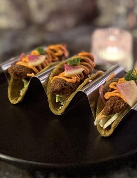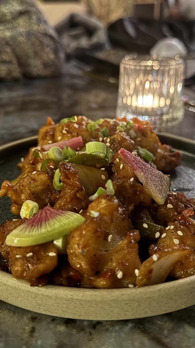 We started with the Gobi Manchurian, featuring crispy cauliflower florets tossed in a tangy, bold Manchurian sauce. It had just the right amount of heat and set the pace for the rest of the meal. The Thepla Chicken Tacos were a fun and inventive surprise. A spiced crispy roti acted as the taco shell, layered with carrot slaw and tandoori mayo. The Momos, an Indo-Tibetan style dumpling served with green pea purée and pickled pearl onions, were delicate and satisfying.
