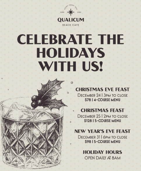 Ring in the holidays with exceptional dining at Qualicum Beach Café. From Christmas Eve to New Year’s Eve, enjoy curated holiday menus crafted to celebrate the magic of the season.