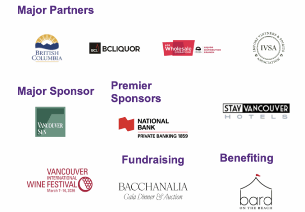 Canada’s premier wine show will mark its 47th edition of pairing wine, food and the performing arts from March 7-14, 2026. The festival will showcase 114 wineries from 14 countries, featured in 33 events over seven days. The Bacchanalia Gala Dinner + Auction, presented by National Bank Private Banking 1859, is the main fundraising event of the festival and kicks off the festival on Saturday, March 7 at the Fairmont Hotel Vancouver. Trade Days takes place Thursday, March 12 and Friday, March 13. The festival is consistently ranked the #1 Food, Wine & Hospitality Event in Canada by New York’s BizBash and was named one of the world’s top 10 wine trade shows by Wine International Association. The festival is produced by the Vancouver International Wine Festival Society, which has three mandates: provide an informative, educational and entertaining wine experience for public and trade; be a premier marketing opportunity for the wine industry and festival partners; and raise funds for the Bard on the Beach Theatre Society. Since inception in 1979, the festival has raised more than $10.3 million for the performing arts. Major sponsor is The Vancouver Sun; major industry partners are the BC Liquor Distribution Branch, BCLIQUOR, and the Import Vintners & Spirits Association. The Vancouver International Wine Festival gratefully acknowledges the financial support of the Province of British Columbia.