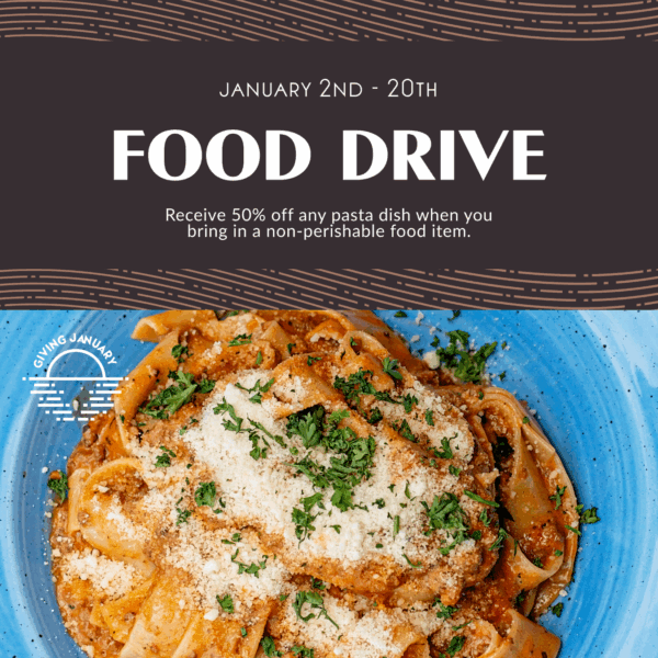 Bring in one non-perishable food donation and enjoy 50% off a pasta dish. A little generosity goes a long way—join us in supporting our community this Giving January!