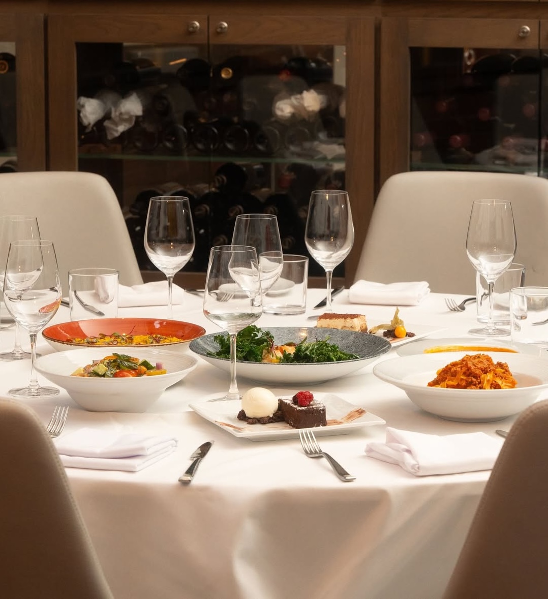 Mains include Handmade Sage-Buttered Pappardelle, Lasagna of Wild Mushrooms, Lemon and Saffron Risotto, or Australian Wagyu/Angus Striploin.