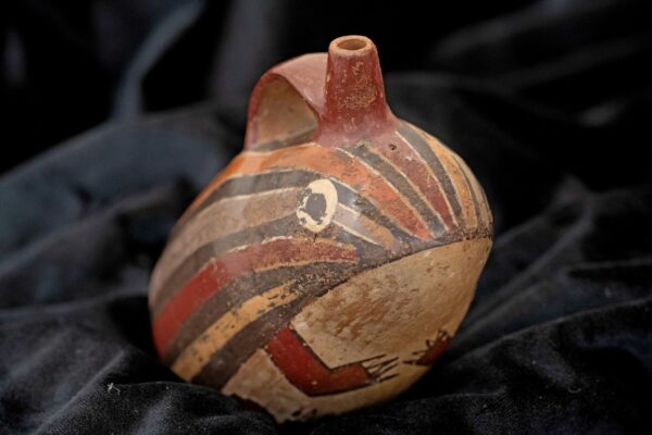 One exhibition highlight includes the display of ancient wind instruments, including a trumpet crafted from a conch shell, panpipes, and ocarinas–a whistling vessel crafted from clay. In Andean cosmology, wind holds deep symbolic and spiritual significance–a powerful force that connects the physical and spiritual realms, and was often invoked during ancient rituals to cleanse spaces, purify individuals, or call upon spiritual allies.