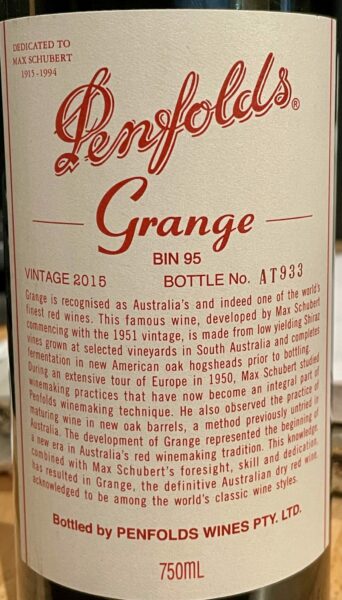This is, indeed, a very special bottle. Australia’s Penfolds Grange is a highly respected name in the world of wine, consistently scoring highly year after year and can last for years, often peaking after 12 to 40+ years. It is a powerful, highly concentrated, and structurally complex wine, made from Syrah (Shiraz in Australia) and a small dash of Cabernet Sauvignon. It is described as “. . . having deep, intense aromas of blackberry, licorice, and roasted chestnut. It is full-bodied, with “thick” tannins and a long, complex finish.” The 2010 was aged for 17 months in new American oak. Big wines like this benefit from a long decant time of three or more hours.