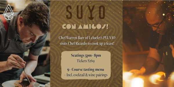 The table is set for another season of collaboration as SUYO Modern Peruvian brings back its popular “SUYO con Amigos” dinner series for a third consecutive year. The quartet of exclusive, one-night-only dinners begins on Tuesday, April 7, as Chef Ricardo Valverde and the SUYO team welcome Chef Warren Barr of Pluvio restaurant + rooms in Ucluelet for an unforgettable evening of inspired West Coast-meets modern Peruvian dining, drinks, and hospitality.