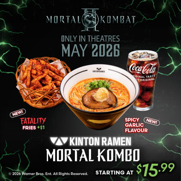 KINTON RAMEN is bringing the heat this spring with the launch of the Mortal Kombo, a limited-time meal inspired by the upcoming theatrical release of New Line Cinema’s MORTAL KOMBAT II. Starting April 1 for a limited time, guests can enjoy the Mortal Kombo from only $14.99 at participating KINTON RAMEN locations across Canada.