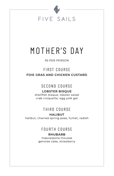 Five Sails is celebrating Mother’s Day with a $95 per person special menu curated by Chef Alex Kim, featuring a refined multi-course dining experience including foie gras and chicken custard, lobster bisque with lobster salad and crab croquette, halibut with charred spring peas and fumet, and a rhubarb dessert with mascarpone mousse, genoise cake, and strawberry for an elegant seasonal finish.